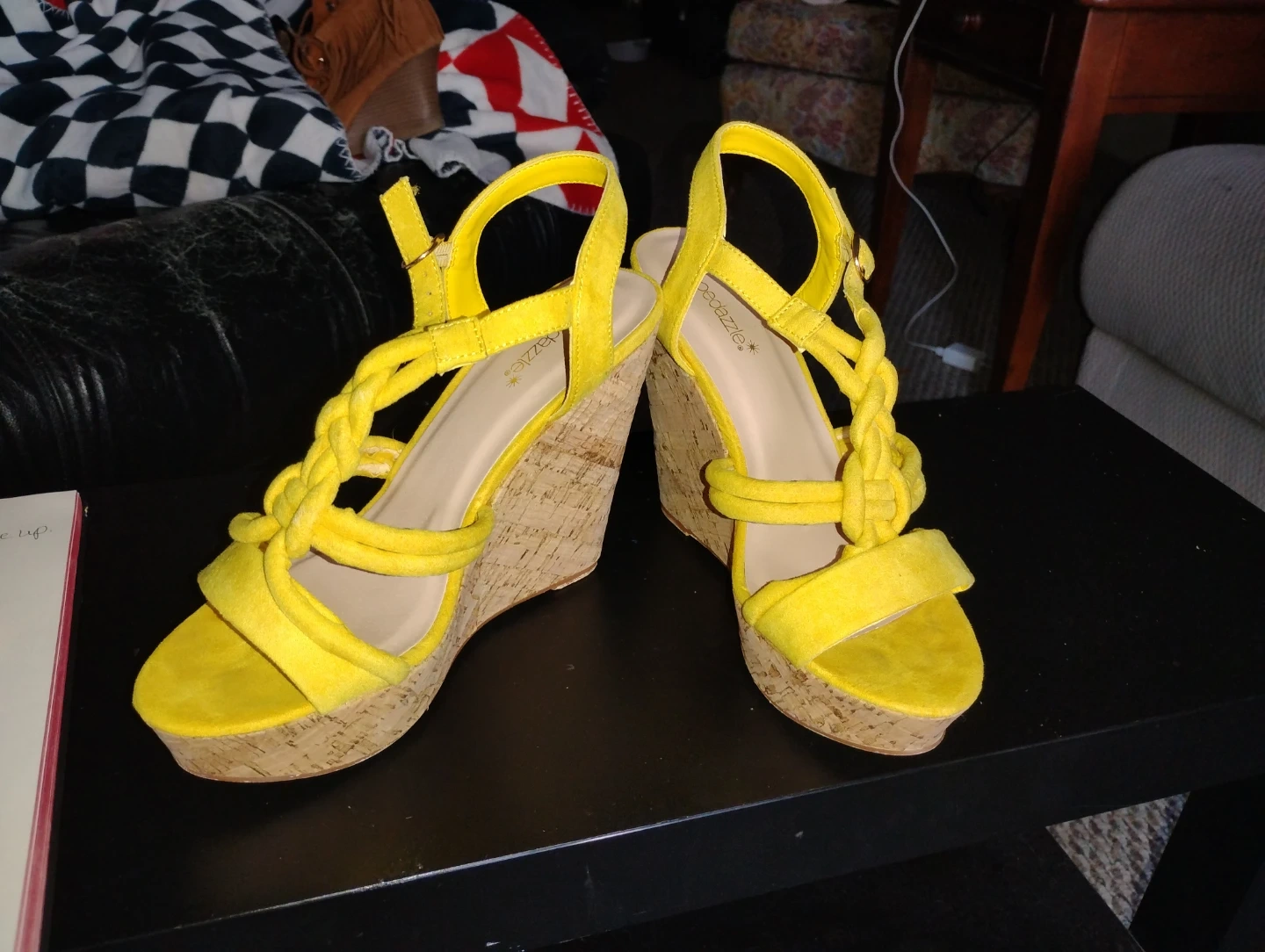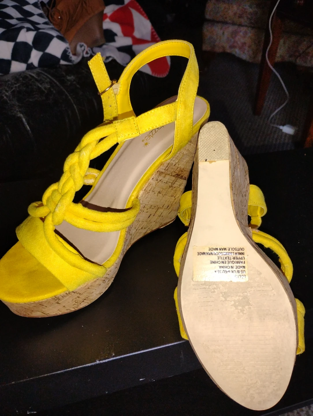 These are bright yellow wedge sandals. They feature braided straps across the front and a buckle closure. The cork wedge heel offers a comfortable lift. Women's, size 8.