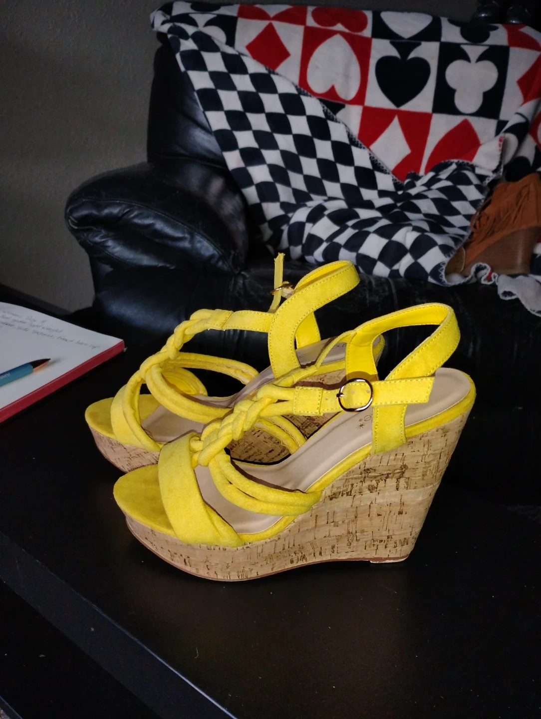 These are bright yellow wedge sandals. They feature braided straps across the front and a buckle closure. The cork wedge heel offers a comfortable lift. Women's, size 8.