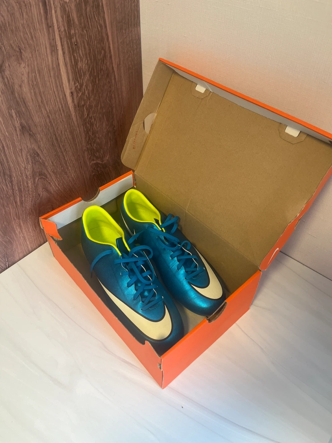 These teal Nike Mercurial soccer cleats come in their original box. They have bright yellow studs for grip on the field. The interior lining is also a bright yellow colour. No scuffs. No marks. Perfect condition. Size 10 women’s