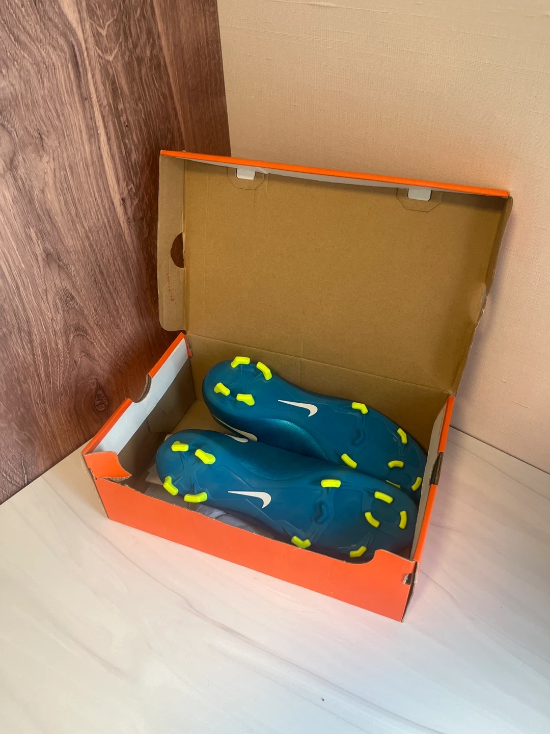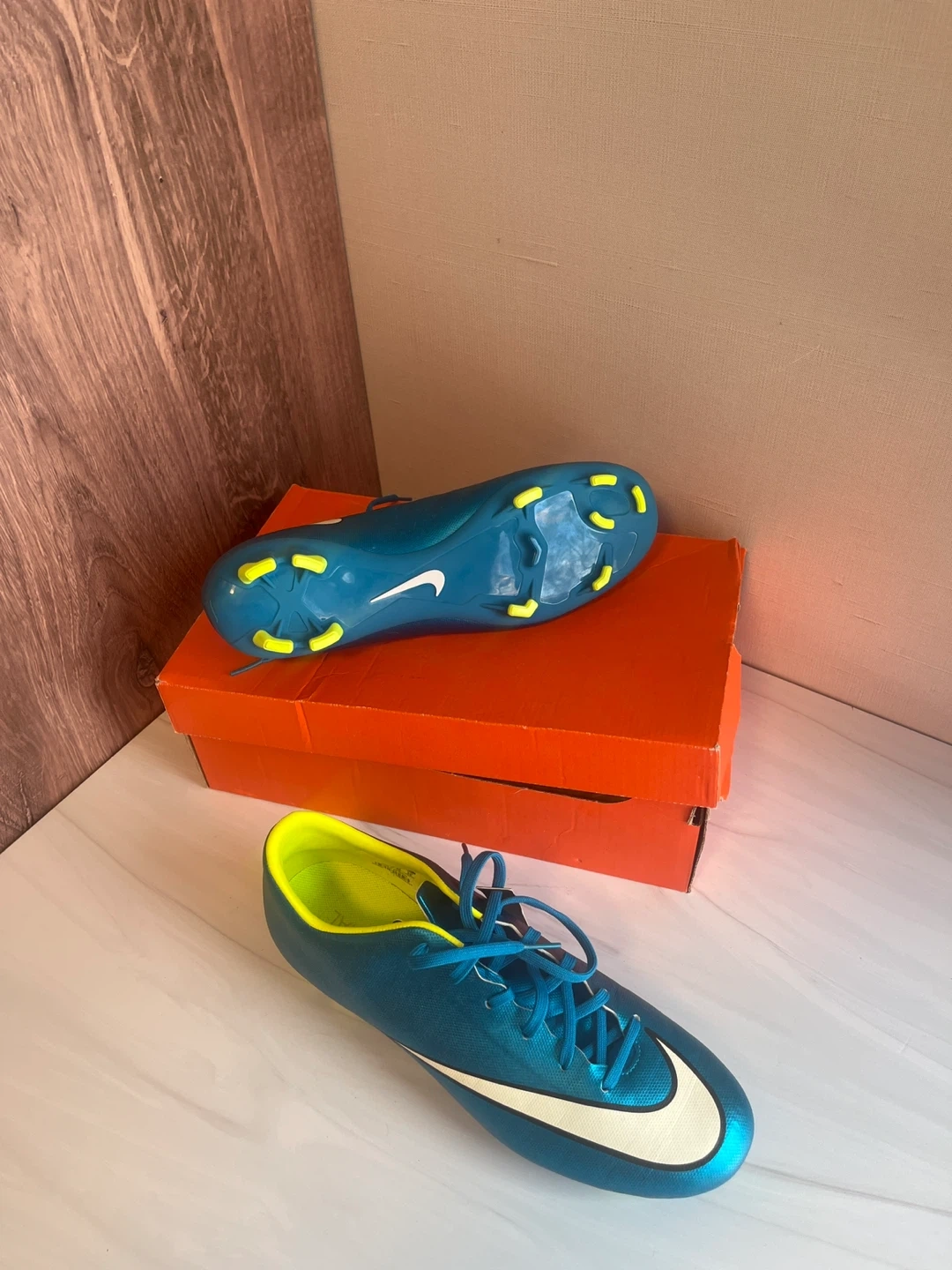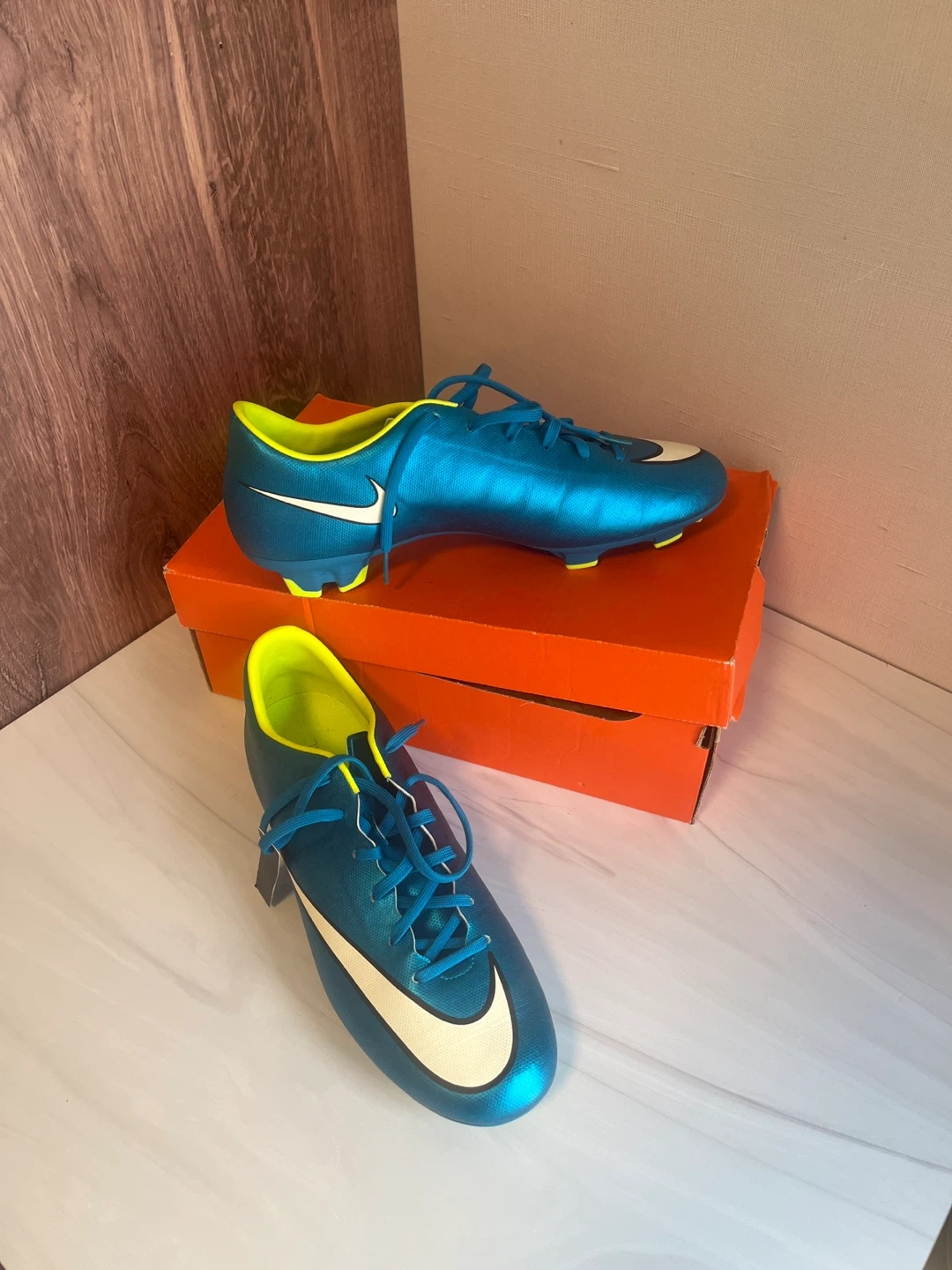 These teal Nike Mercurial soccer cleats come in their original box. They have bright yellow studs for grip on the field. The interior lining is also a bright yellow colour. No scuffs. No marks. Perfect condition. Size 10 women’s