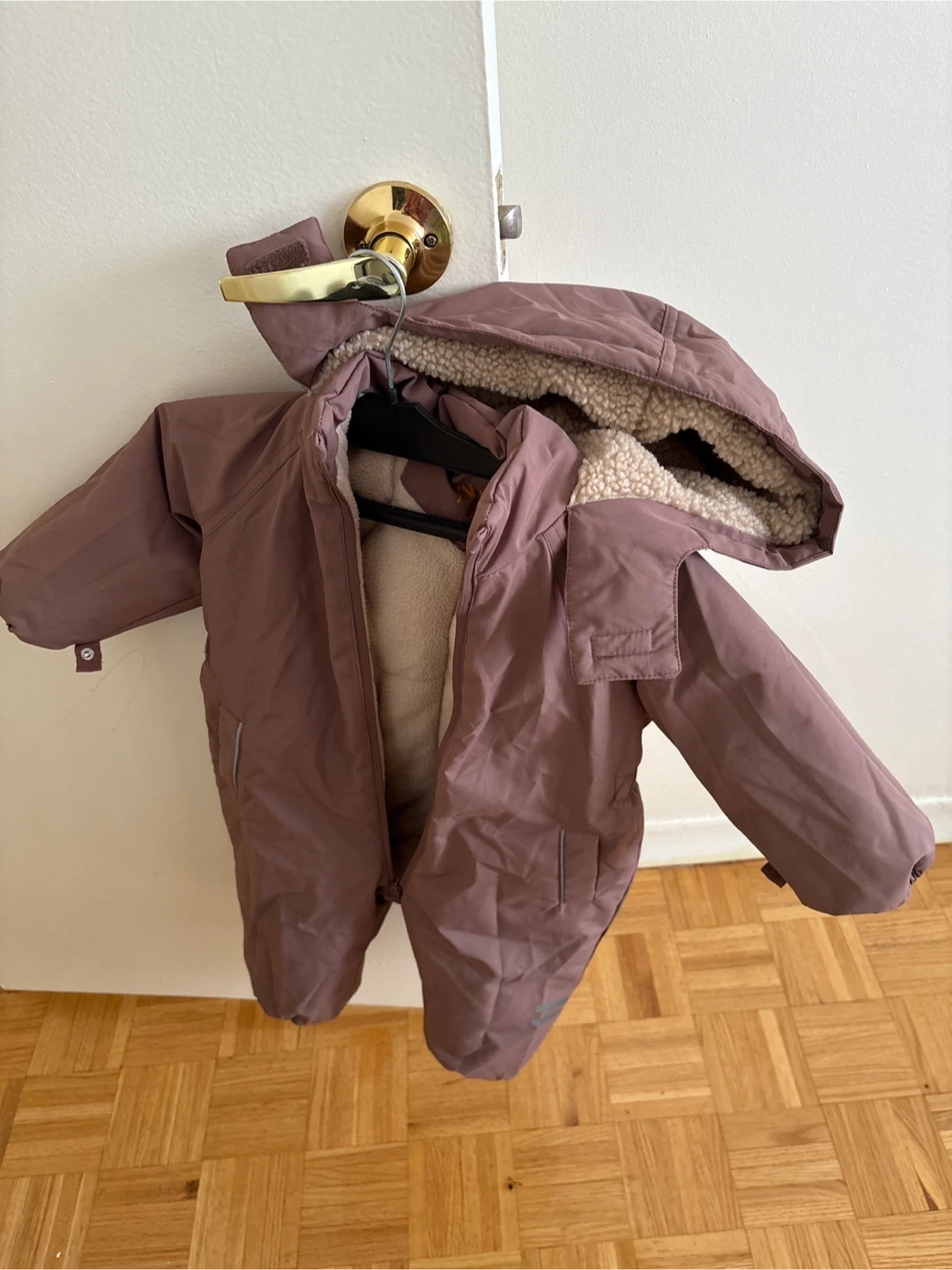 Zara infant bunting snowsuit in dusty rose. It's a size 18-24 months, CM 92. Features a cosy sherpa lining and a full zip closure. This snowsuit is perfect for keeping your little one warm during colder months!