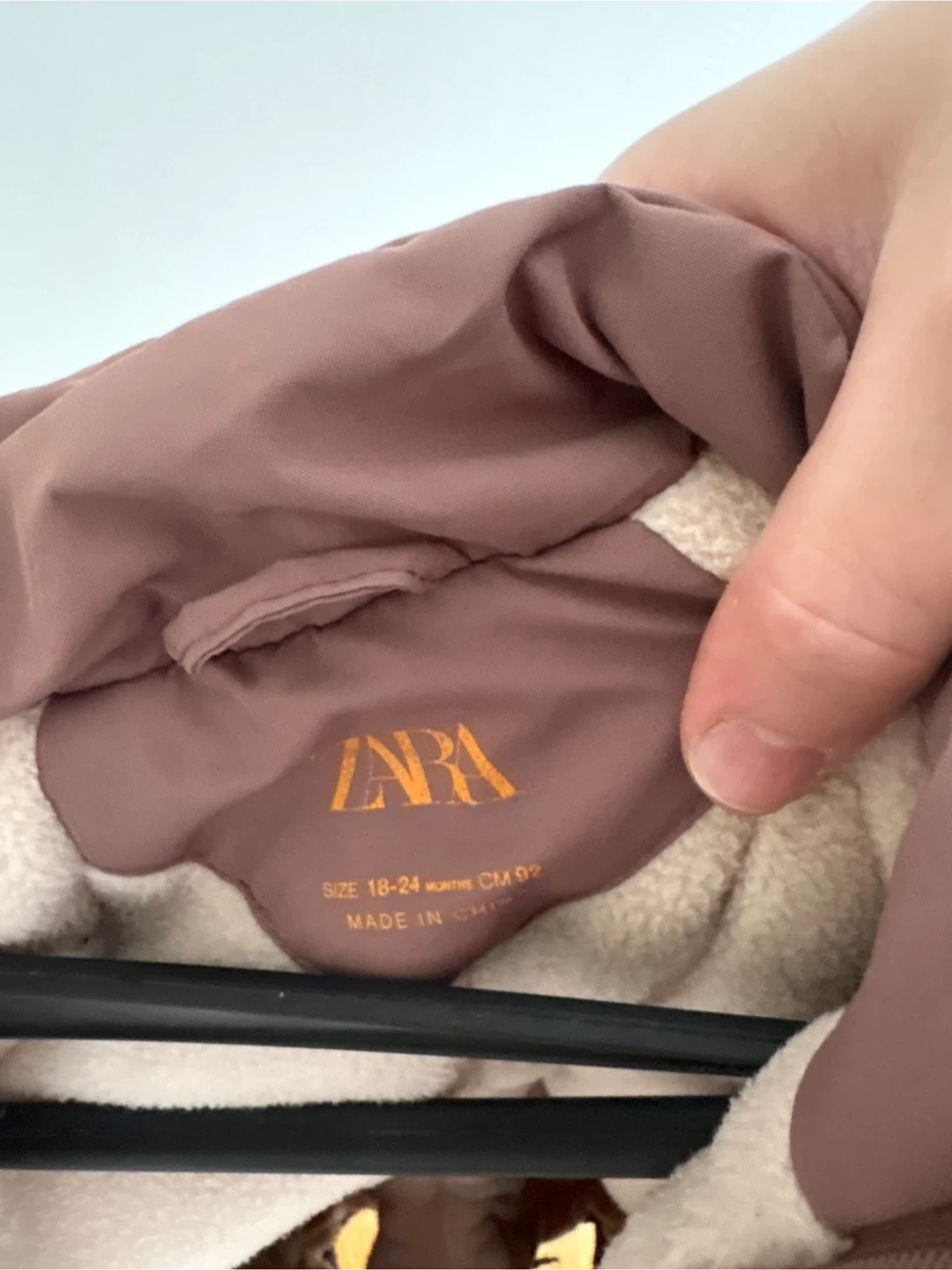 Zara infant bunting snowsuit in dusty rose. It's a size 18-24 months, CM 92. Features a cosy sherpa lining and a full zip closure. This snowsuit is perfect for keeping your little one warm during colder months!