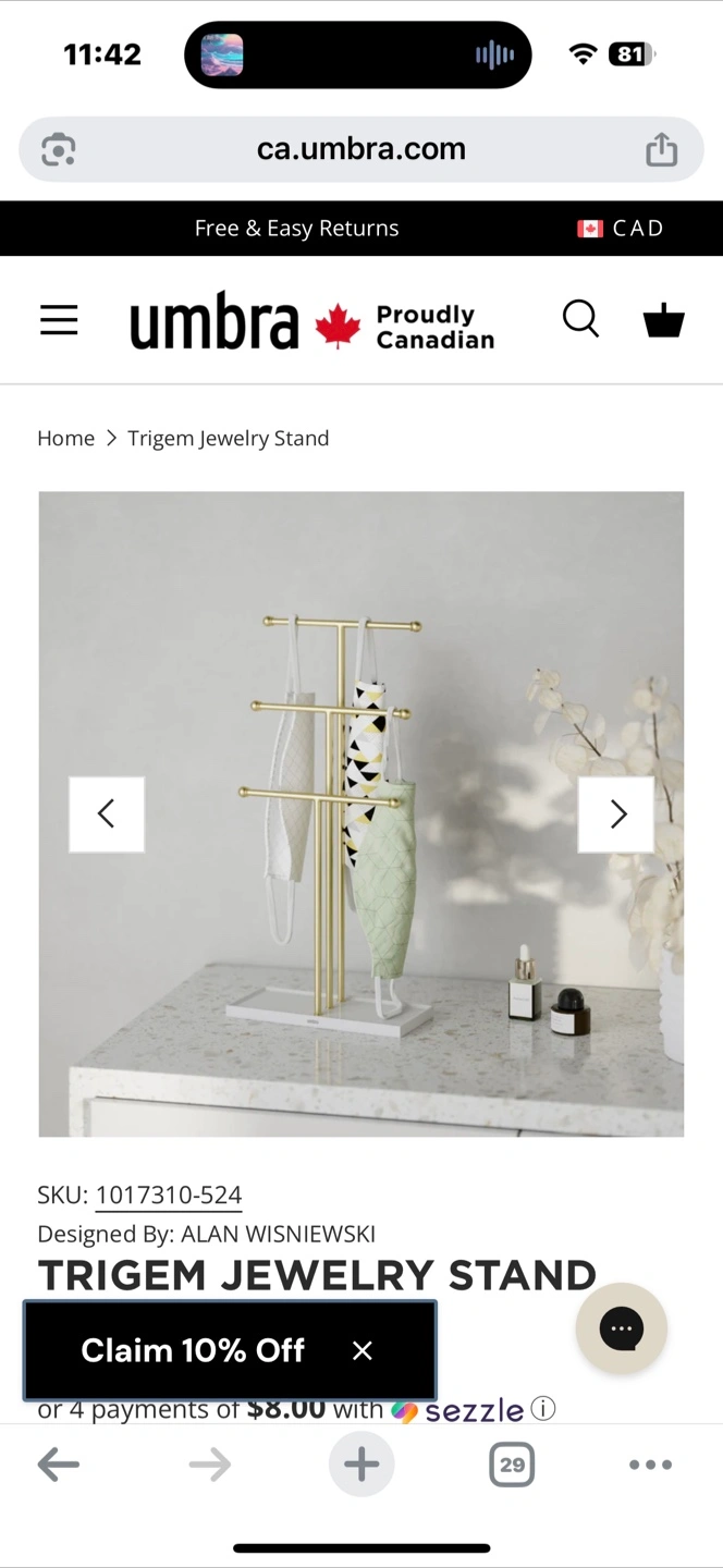 Selling an Umbra Trigem Jewelry Stand. This stylish stand is perfect for organizing your necklaces, bracelets, and earrings. The sleek design will add a touch of elegance to any space. It's in great condition and ready for a new home! First picture is the closest I can find. This one has a black bottom! Original packaging included!