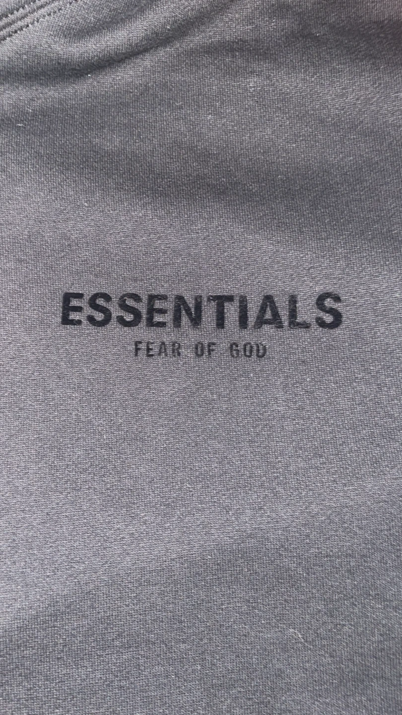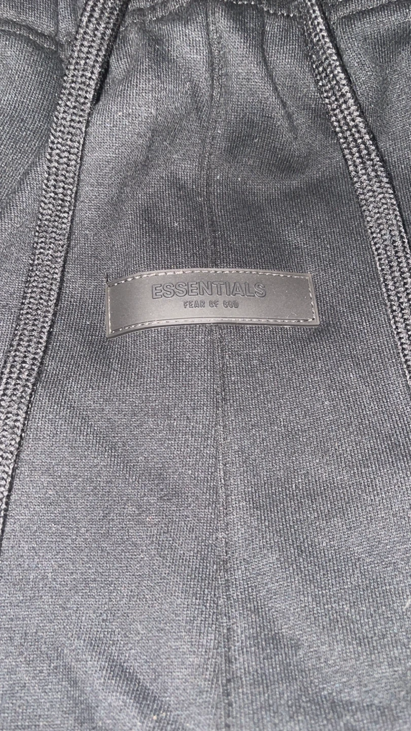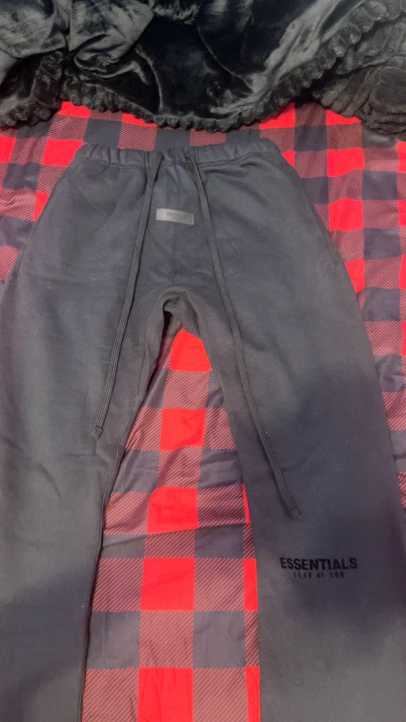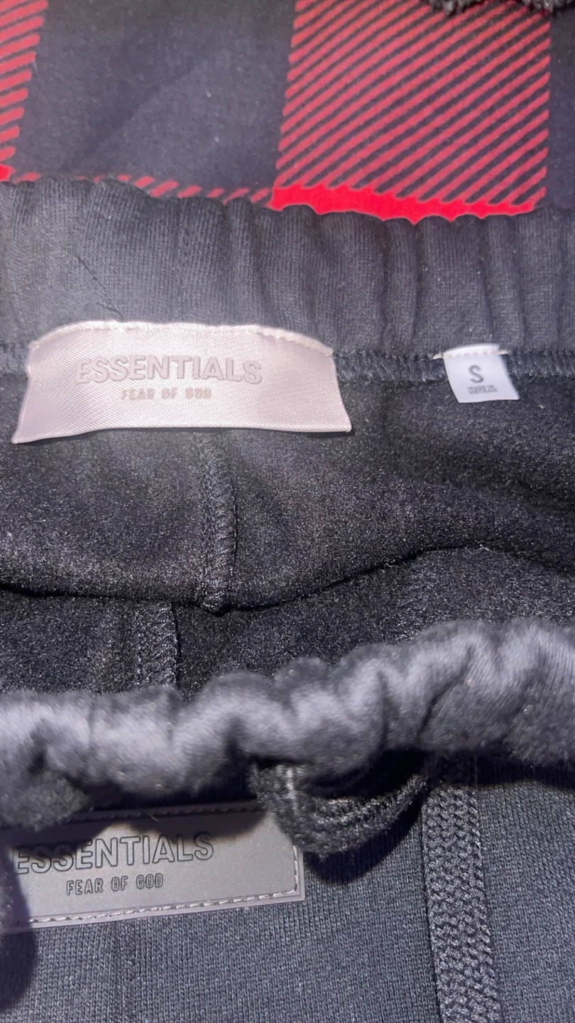This is a Fear of God Essentials black hoodie and sweatpants set. The set is size small. It's made of a soft, comfortable material perfect for casual wear.