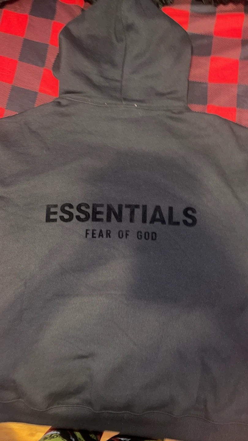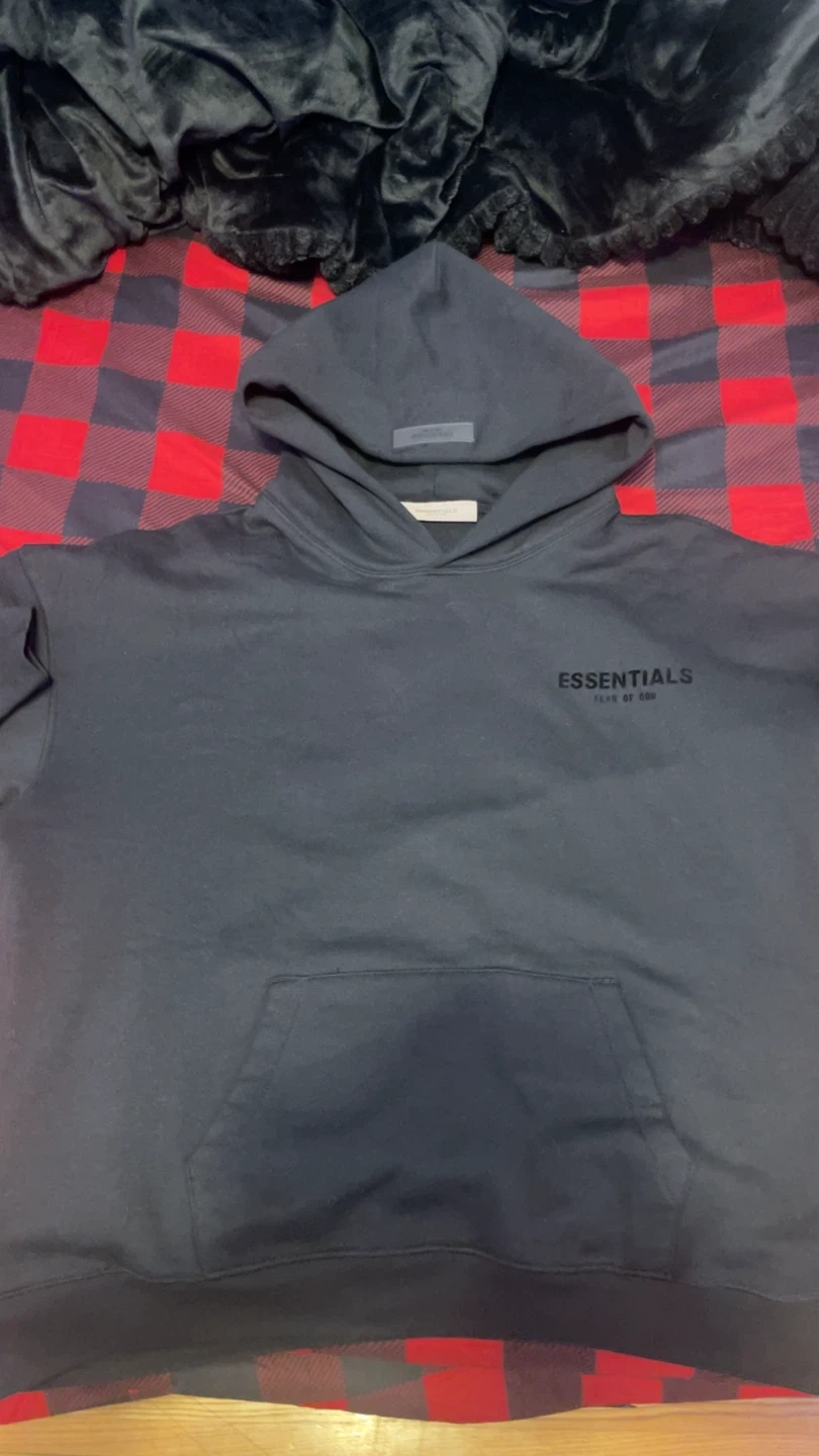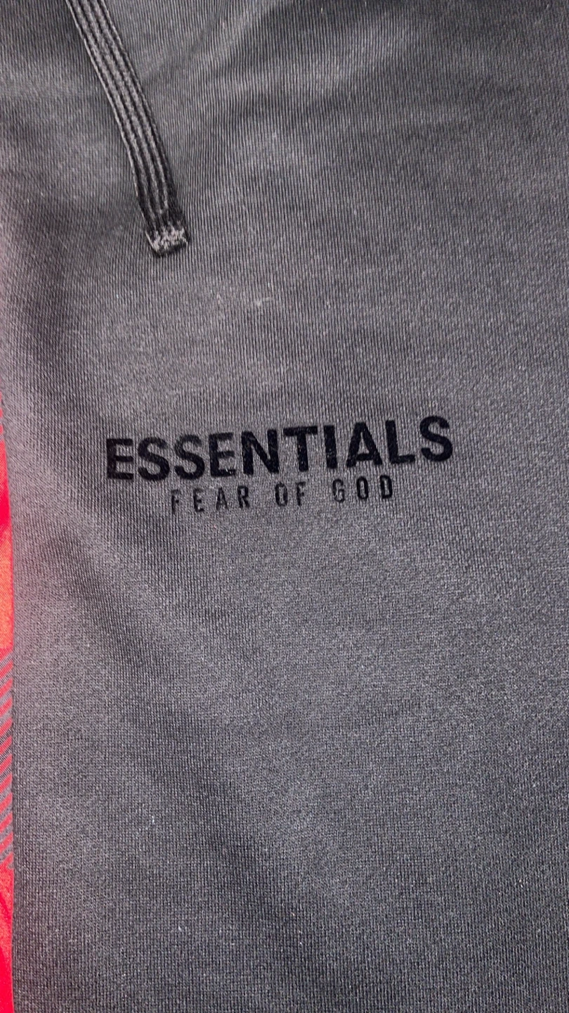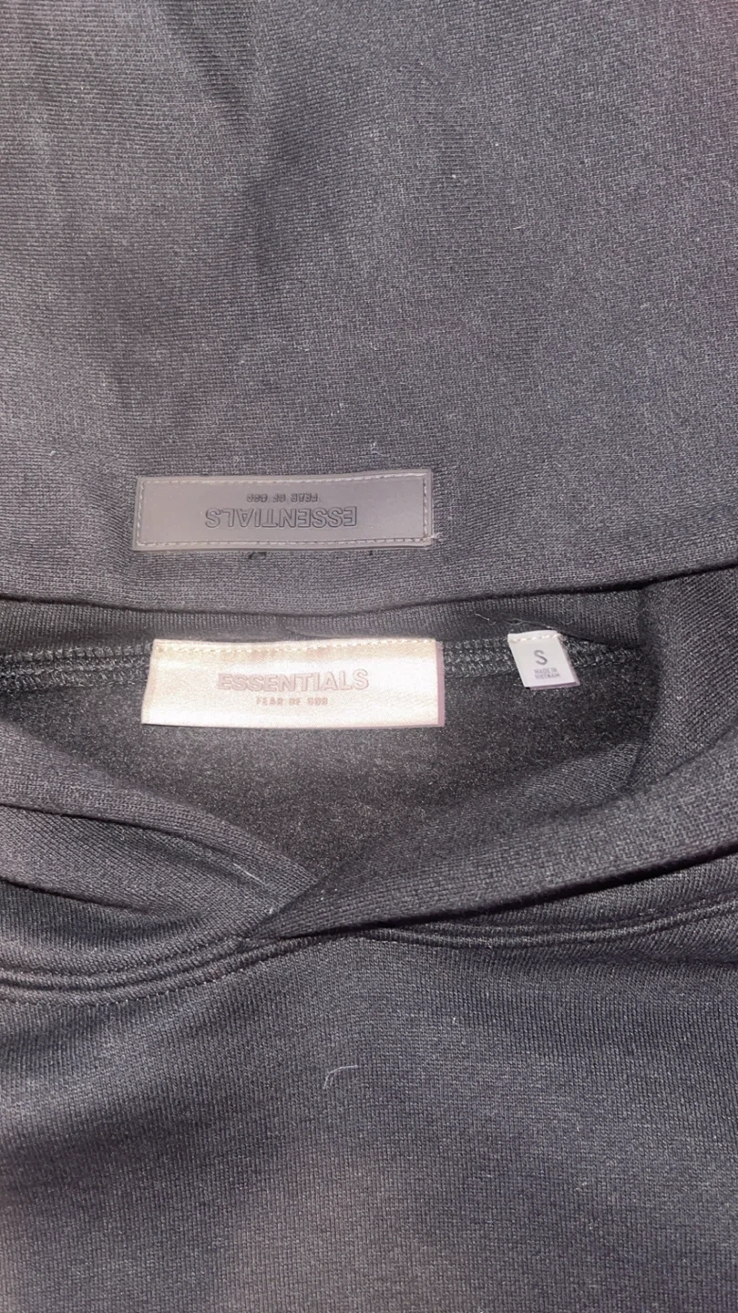 This is a Fear of God Essentials black hoodie and sweatpants set. The set is size small. It's made of a soft, comfortable material perfect for casual wear.