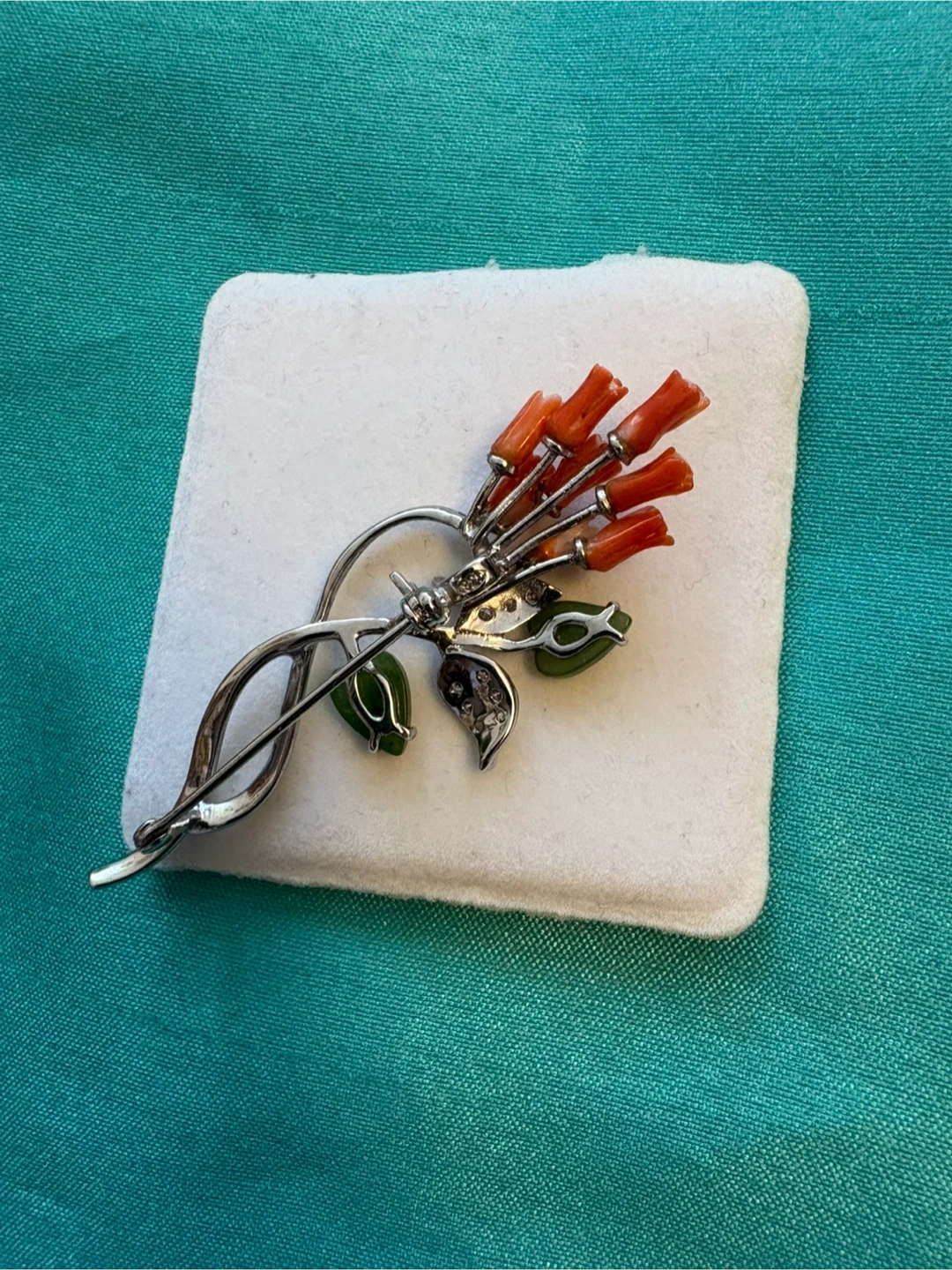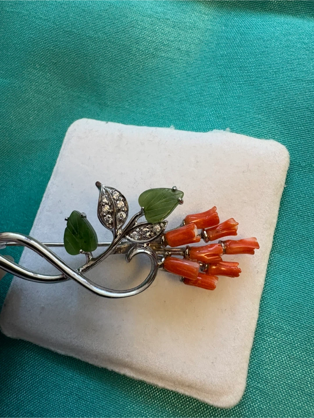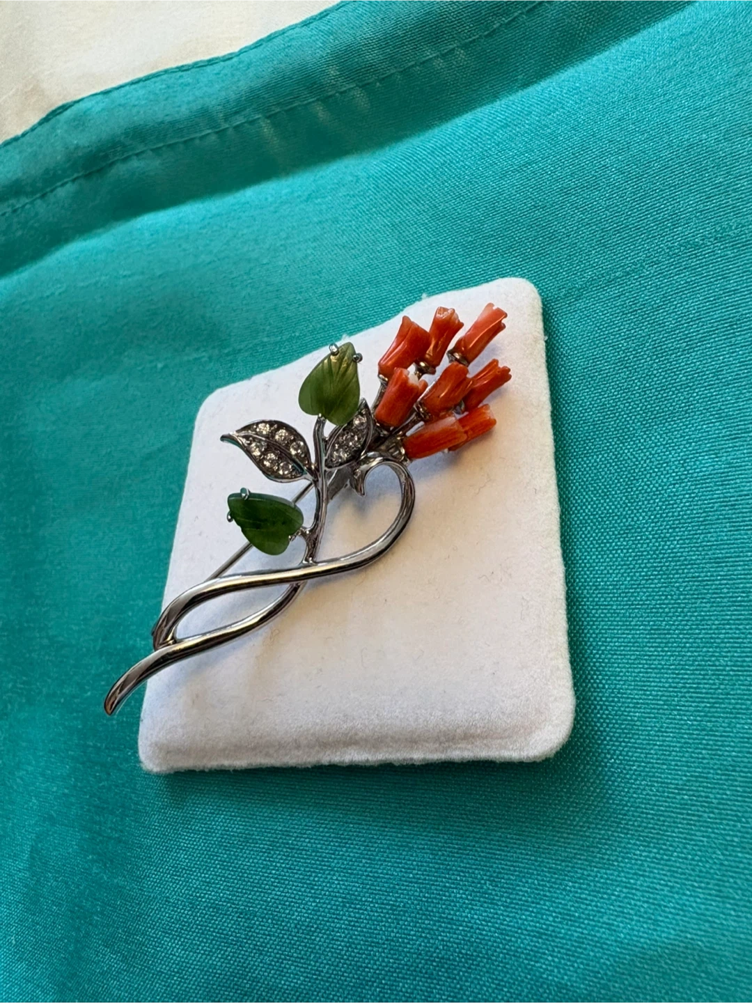 This is a beautiful vintage brooch featuring coral and jade in a floral design. The silver-tone metal complements the vibrant colours of the coral and jade. A lovely piece to add to any collection!