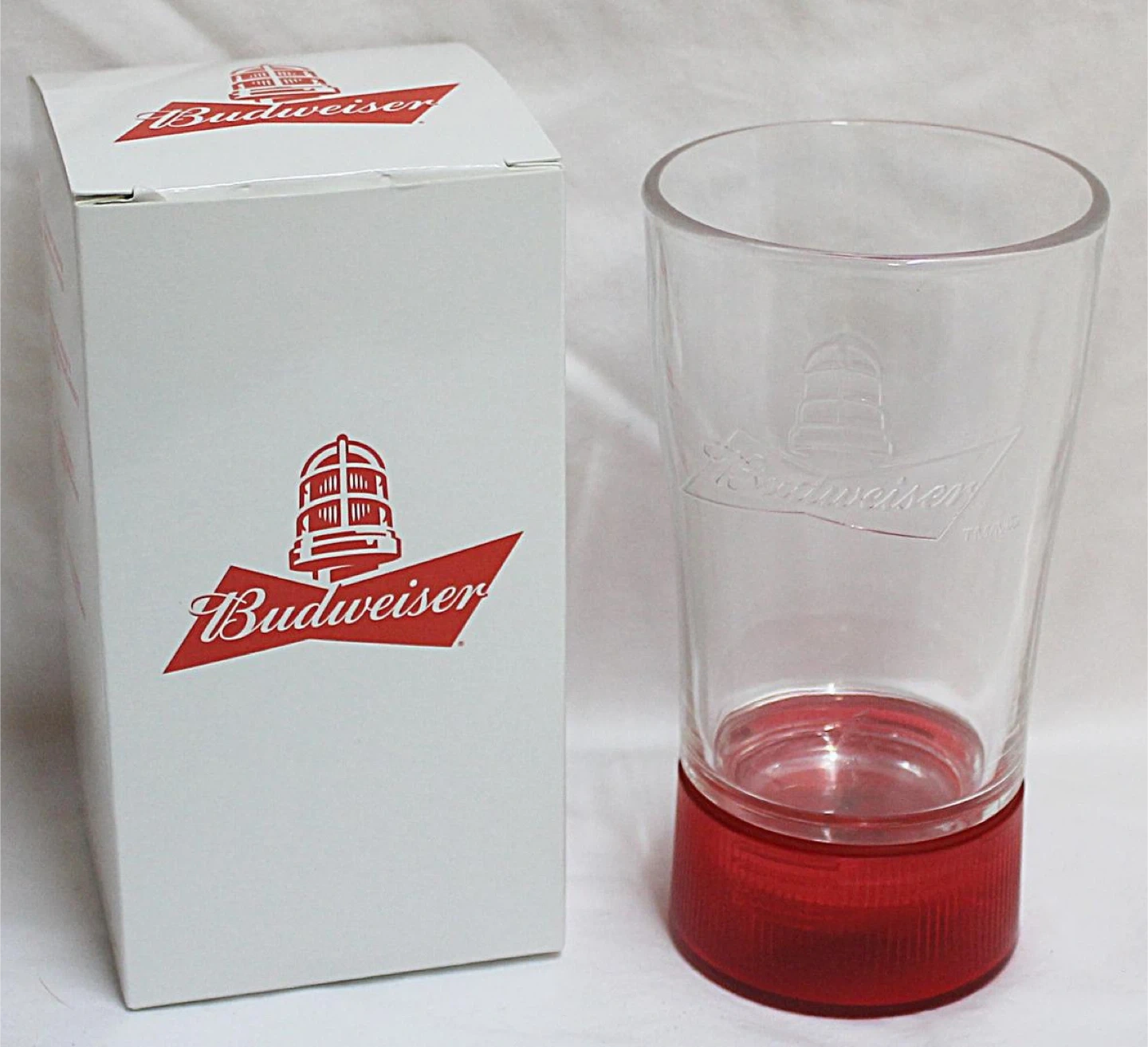 One new, with original box, Budweiser Red Light Score-Synced, beer glass. Using the Budweiser Red Light App, you can sync the glass to your favorite team, and when your team scores, it will set off the red light at the bottom of the glass! requires 2x AAA batteries, (NOT INCLUDED).