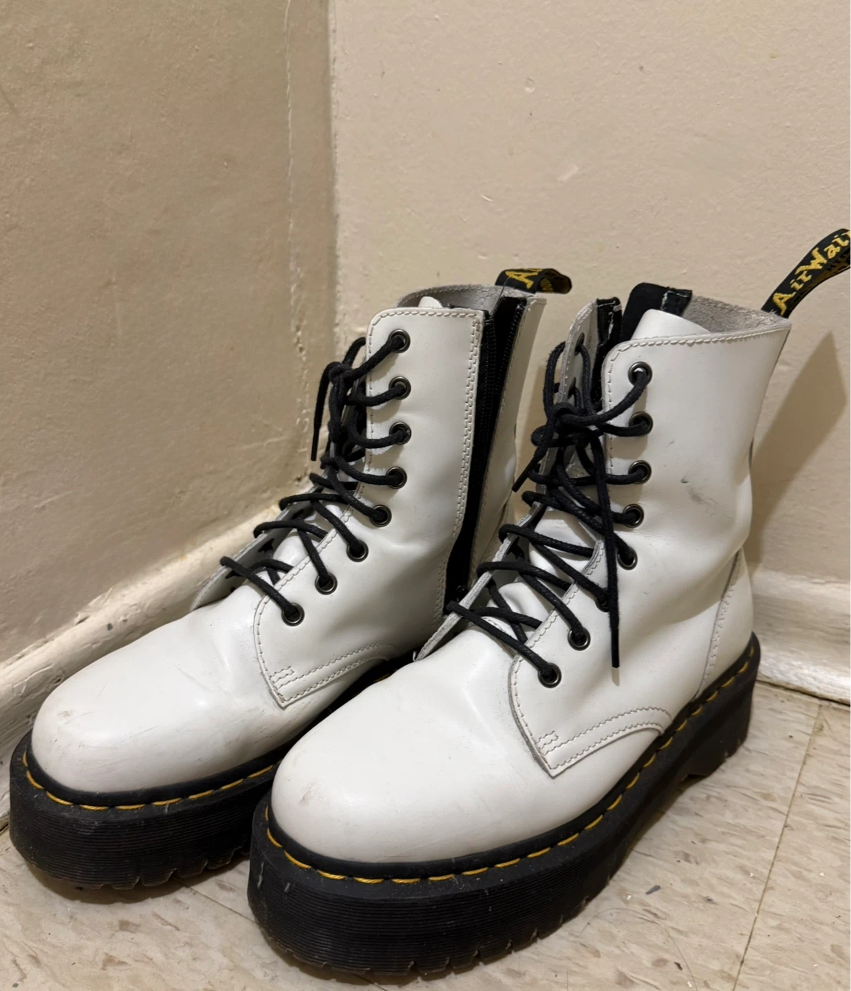 White leather Dr. Martens platform boots with black laces and a side zipper.