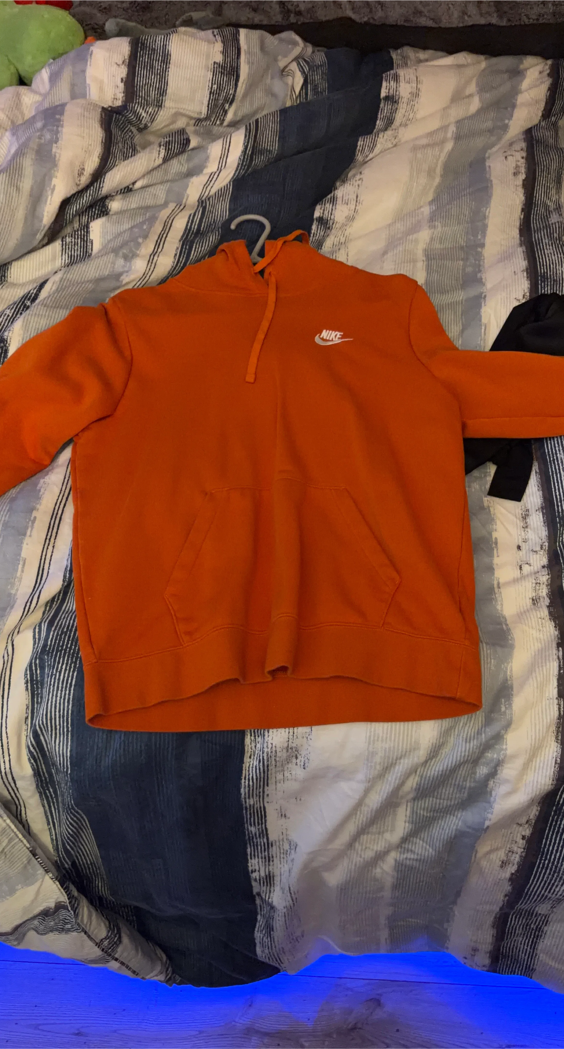 This is a Nike orange pullover hoodie. It features a kangaroo pocket and adjustable drawstring hood. Made from a soft cotton blend for comfort.