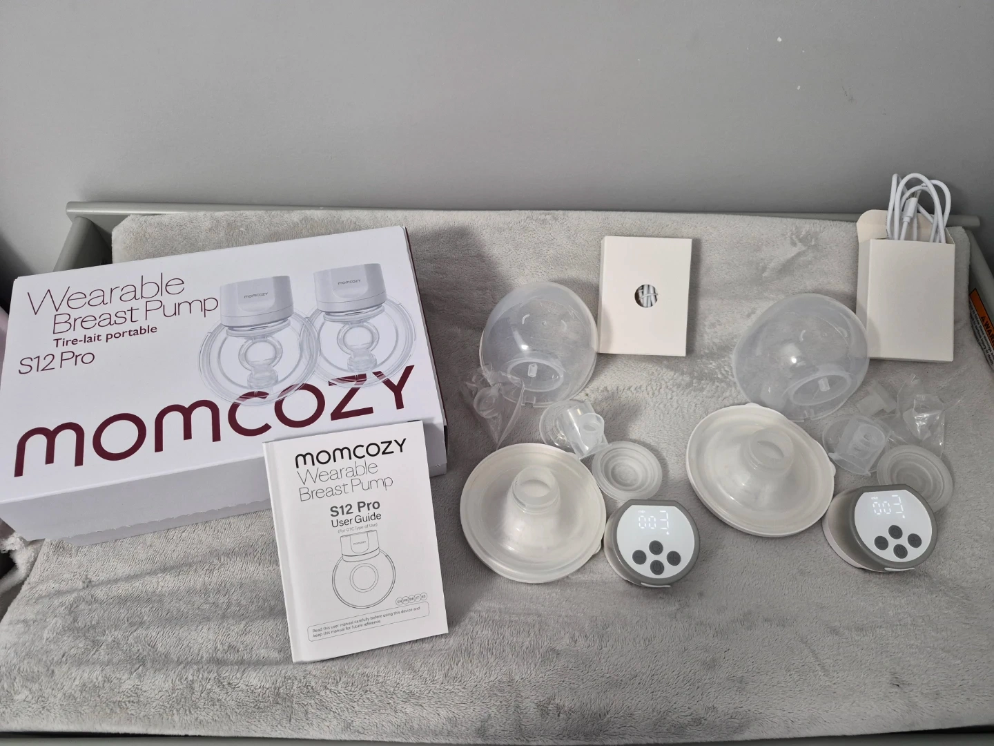 Selling a Momcozy S12 Pro Wearable Breast Pump! It's designed for convenience with features like one-click pause, memory function, quiet operation at 50 dB, and a 30-minute auto shut-off. Comes with the box and all included components