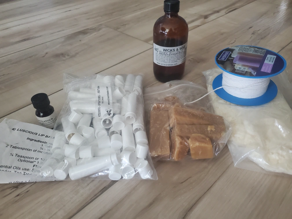 A collection of candle making supplies, including bee wax, soy wox, wicks, scent(baby powder)
