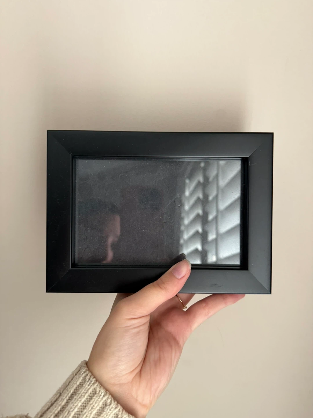 This is a black tabletop picture frame. It has a stand for display and can hold photos or artwork. It's a simple way to showcase your favourite memories!