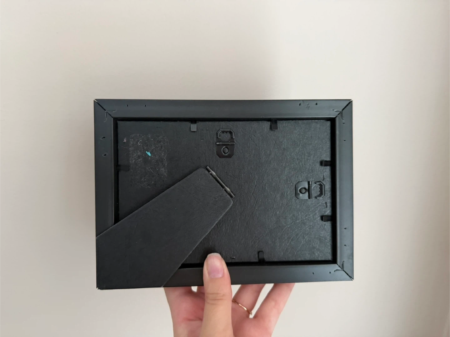 This is a black tabletop picture frame. It has a stand for display and can hold photos or artwork. It's a simple way to showcase your favourite memories!
