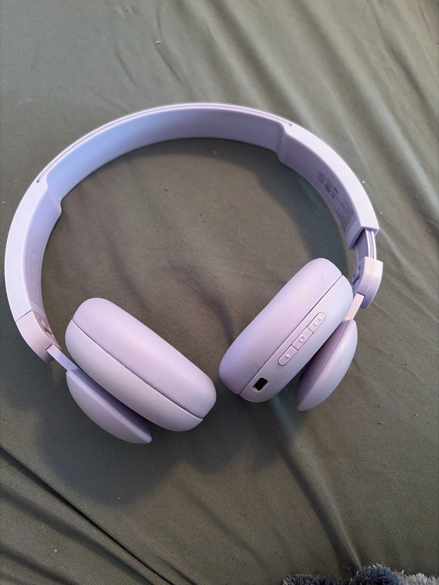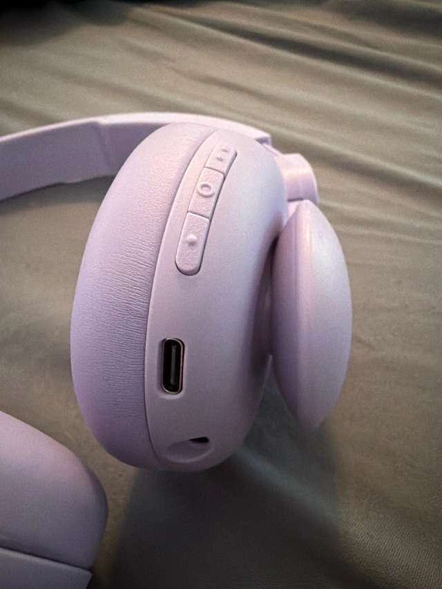 Barely used purple Onn headphones with good sound. They have an adjustable fit and charge fast via USB-C. Holding down the 'O' button turns on Bluetooth.