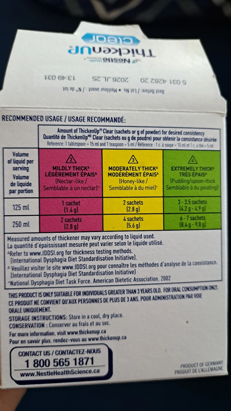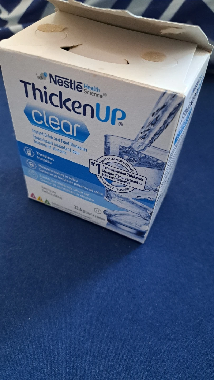 This is an instant drink and food thickener that's tasteless and helps maintain texture in saliva. It locks consistency once set and is easy to use. Contains 21 sachets, each 1.4g.