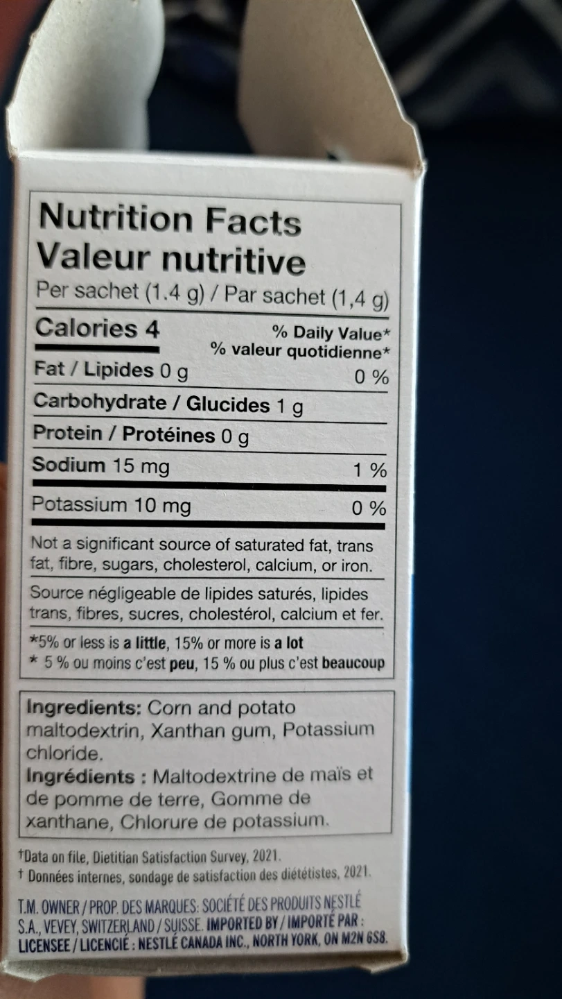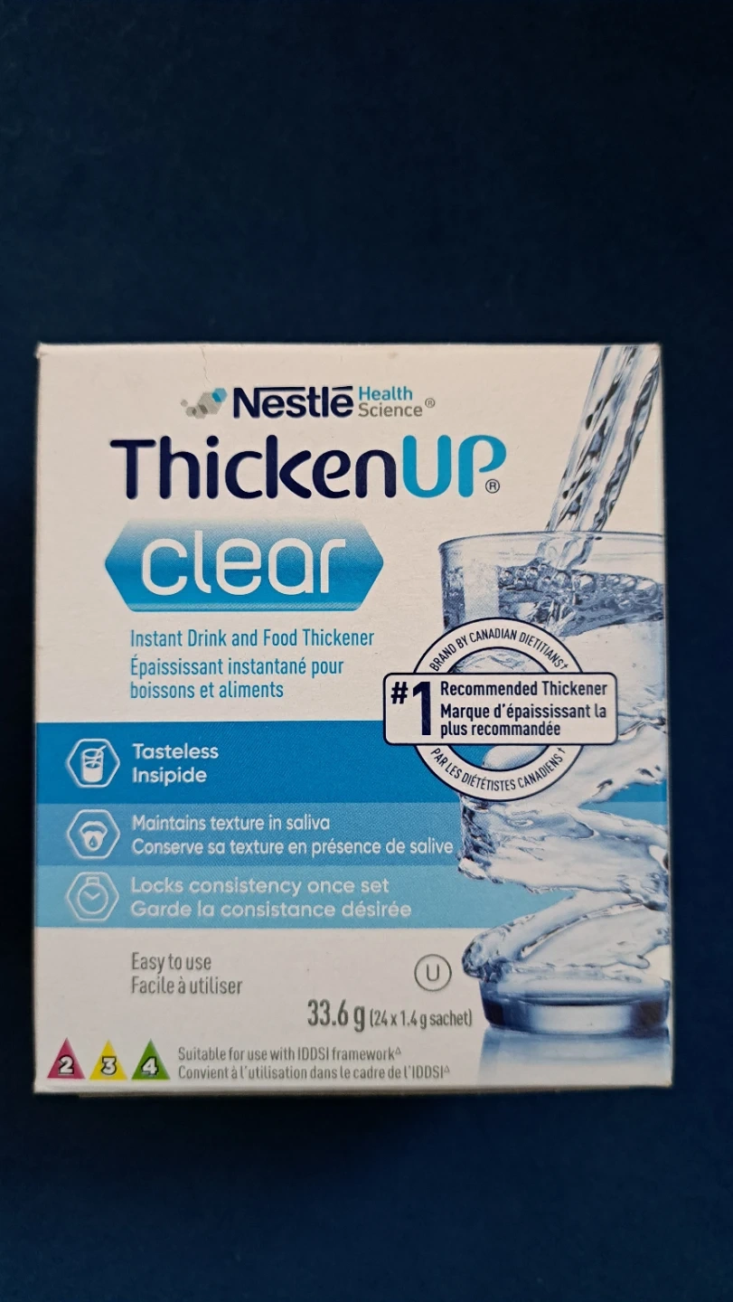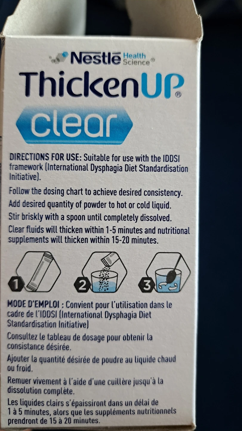 This is an instant drink and food thickener that's tasteless and helps maintain texture in saliva. It locks consistency once set and is easy to use. Contains 21 sachets, each 1.4g.