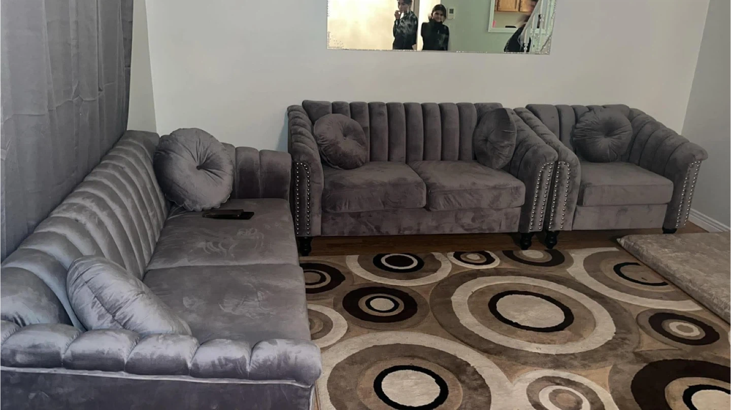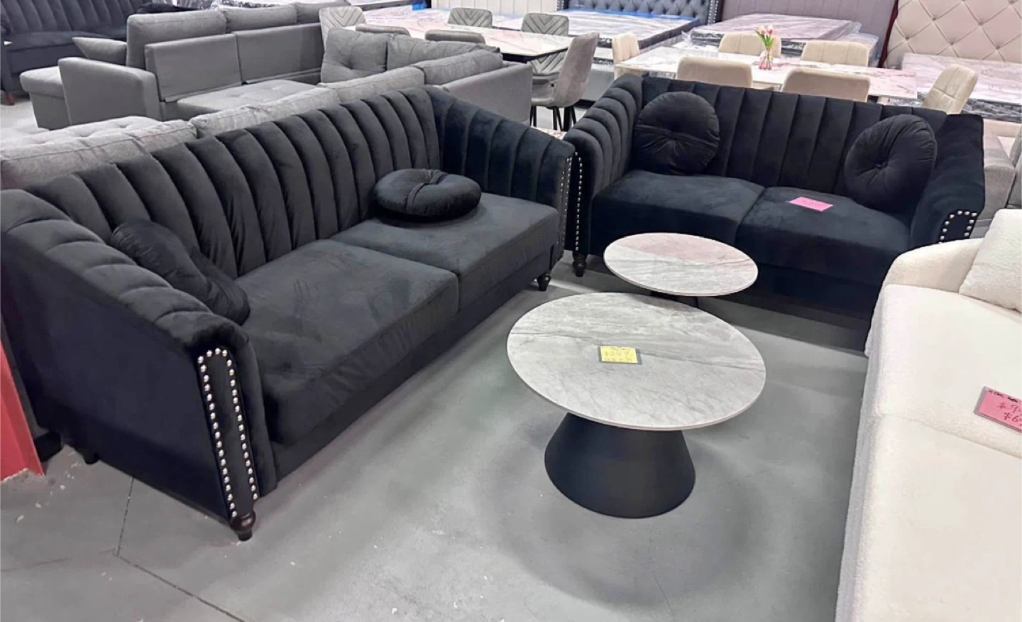 Selling a beautiful black velvet sofa set. It's in great condition and would look amazing in any living room! The set includes a sofa and a loveseat, both with stylish details.