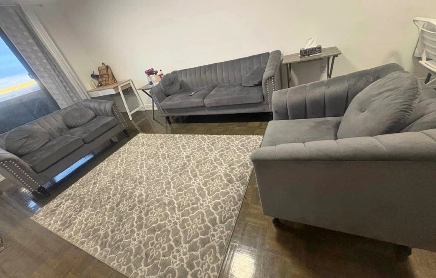 Selling a beautiful black velvet sofa set. It's in great condition and would look amazing in any living room! The set includes a sofa and a loveseat, both with stylish details.