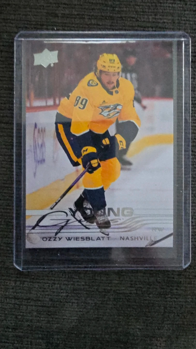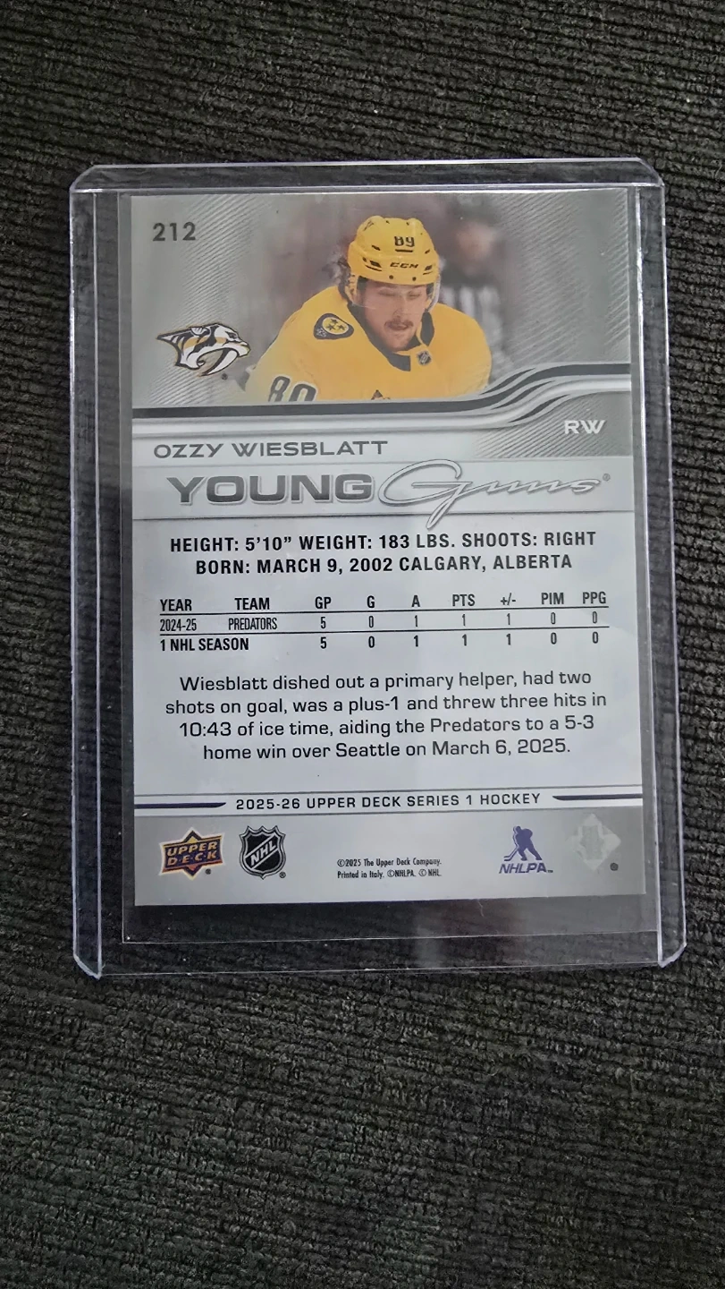 This is a mint condition Ozzy Wiesblatt Young Guns rookie card from the 2025-26 Upper Deck Series 1 hockey set. It details his stats and career highlights from the 2024-25 NHL season. This card is perfect for collectors of young NHL talent.
