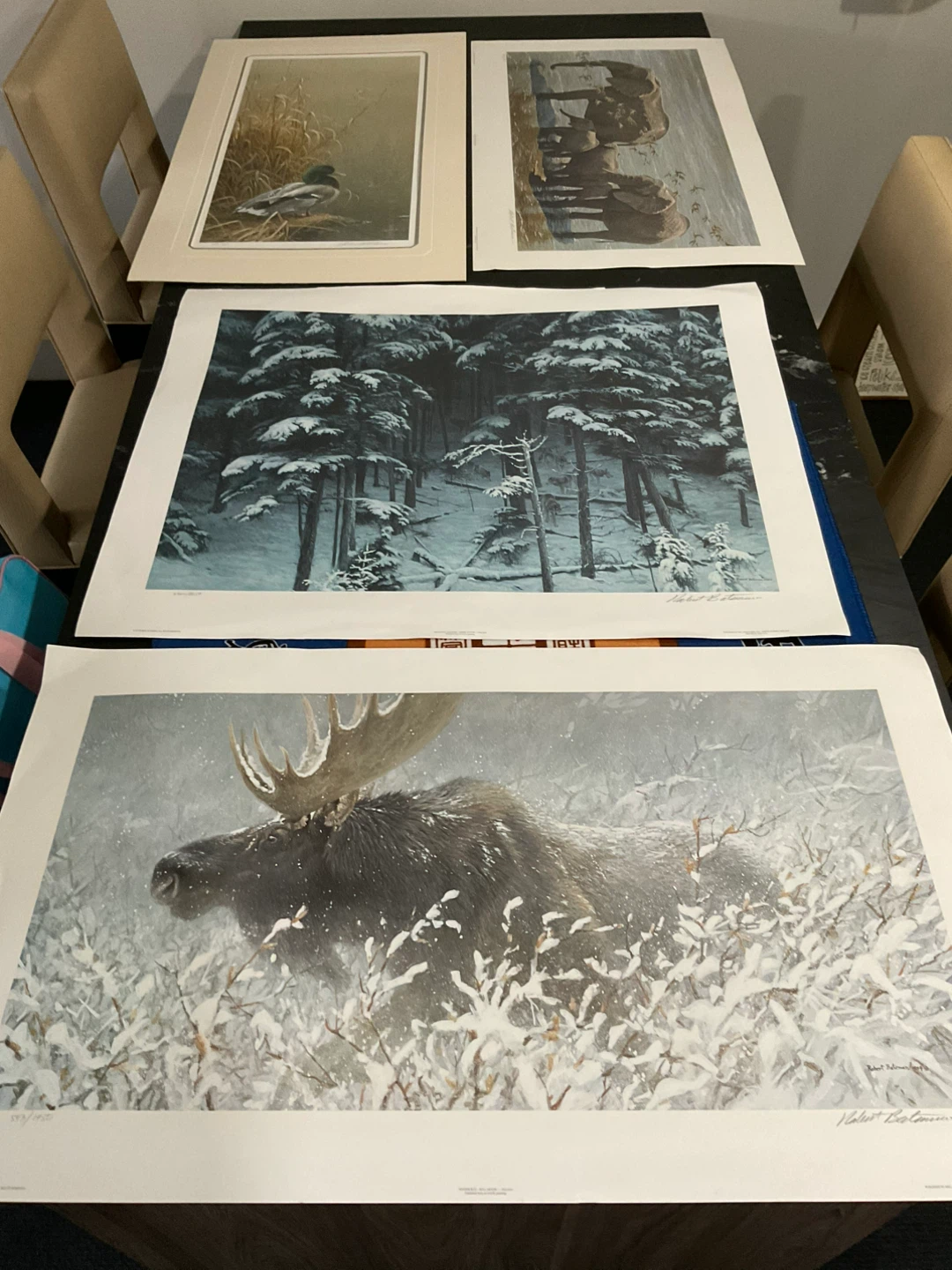 Collection of four wildlife art prints, including a moose in winter and a duck. The prints are by artist Robert Bateman and appear to be limited editions. They're beautifully detailed nature scenes. $100 each or all four for 300.