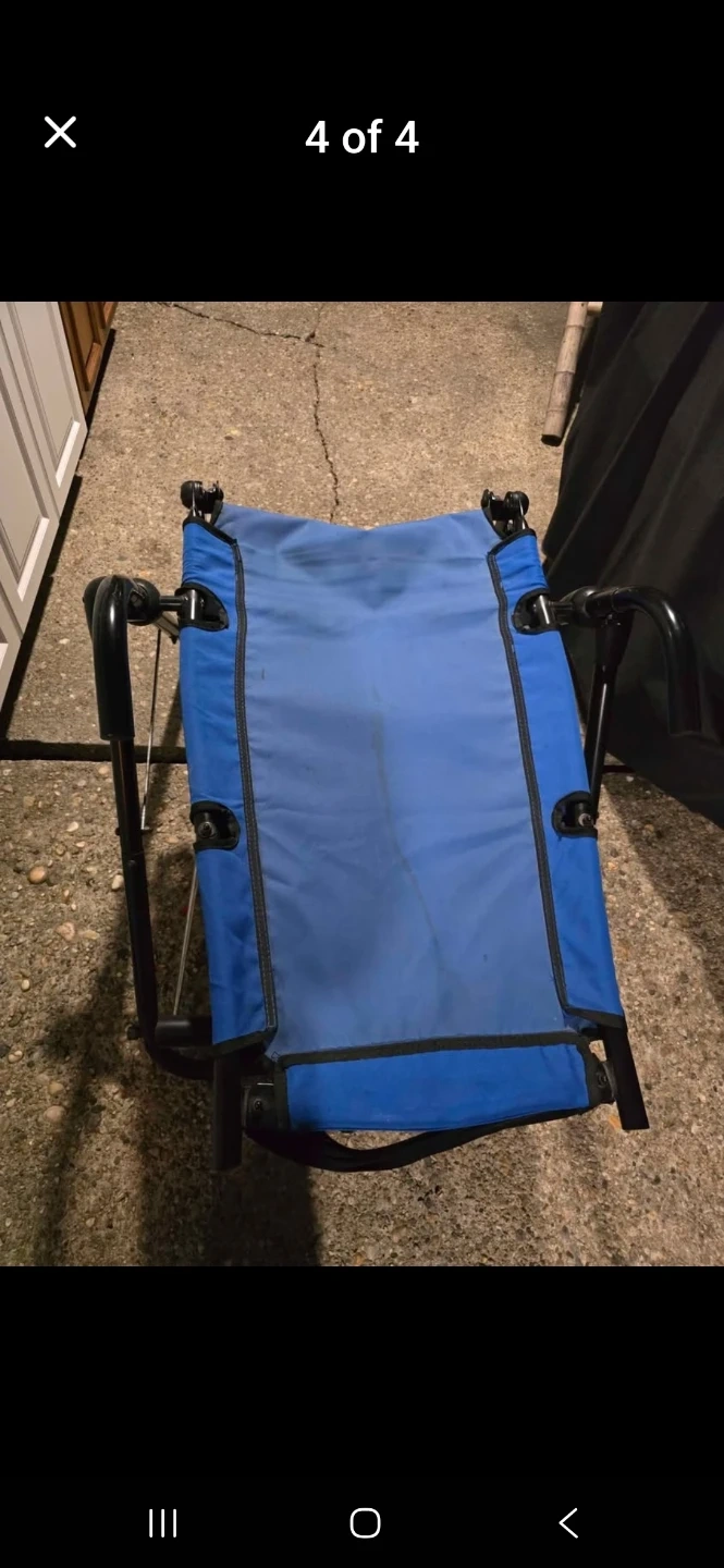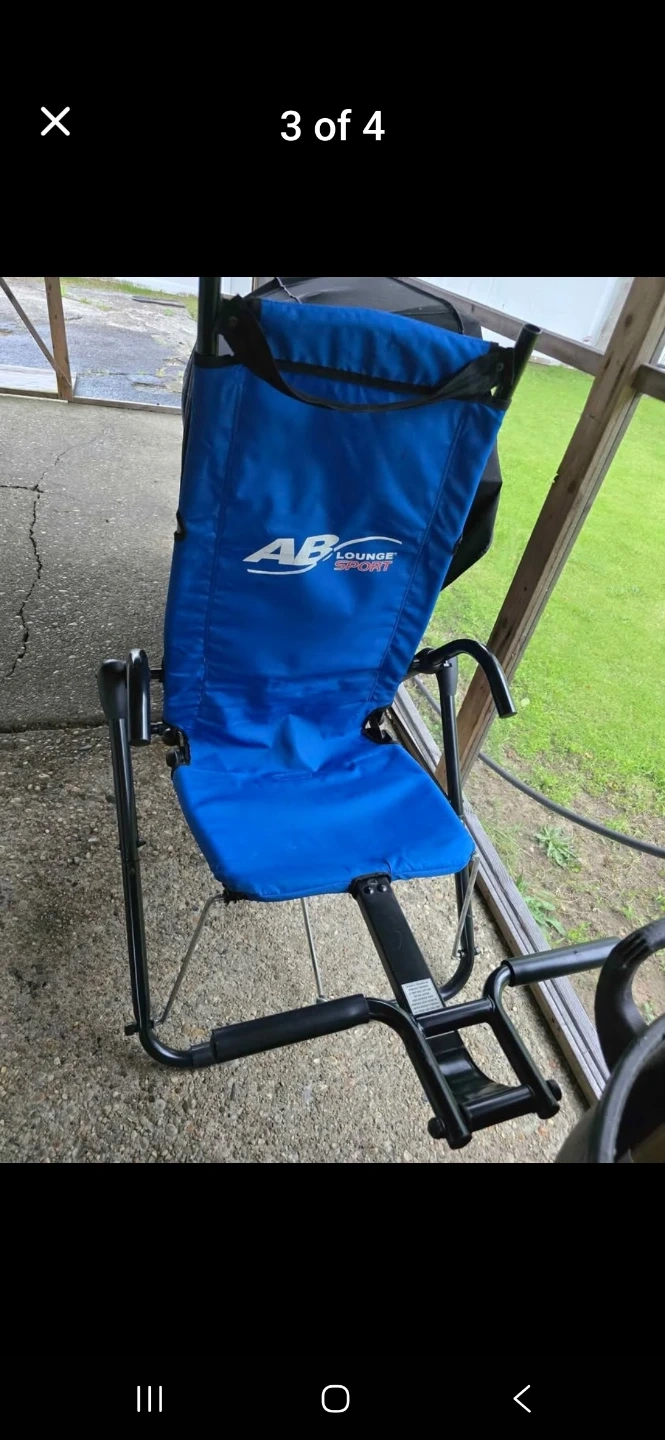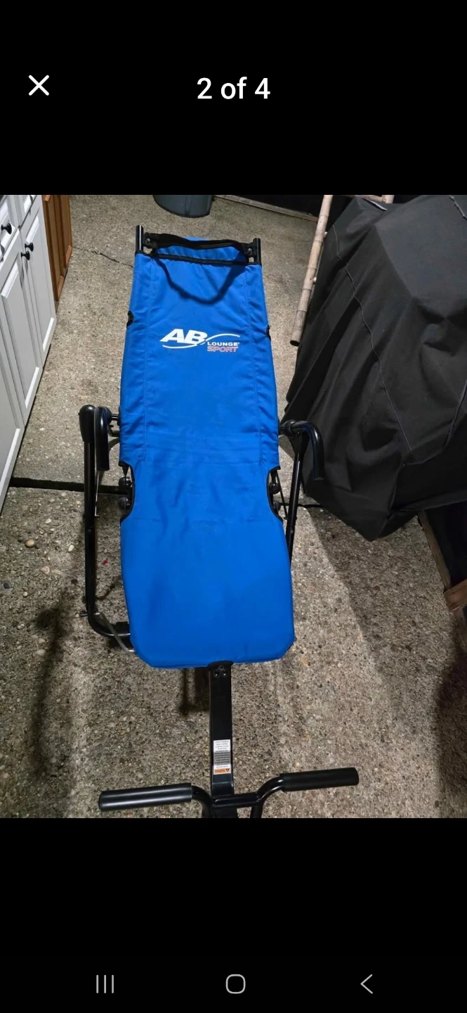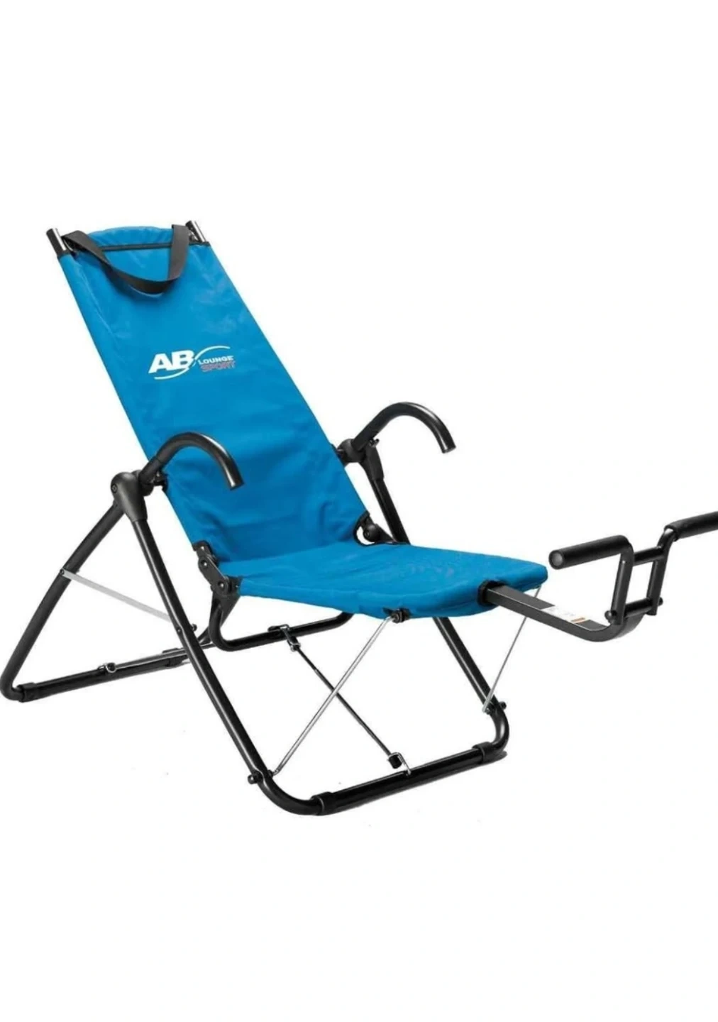 Blue Ab Lounge Sport chair with black metal frame. It's a foldable lounge chair with adjustable footrest and armrests. Fabric seat and back.
