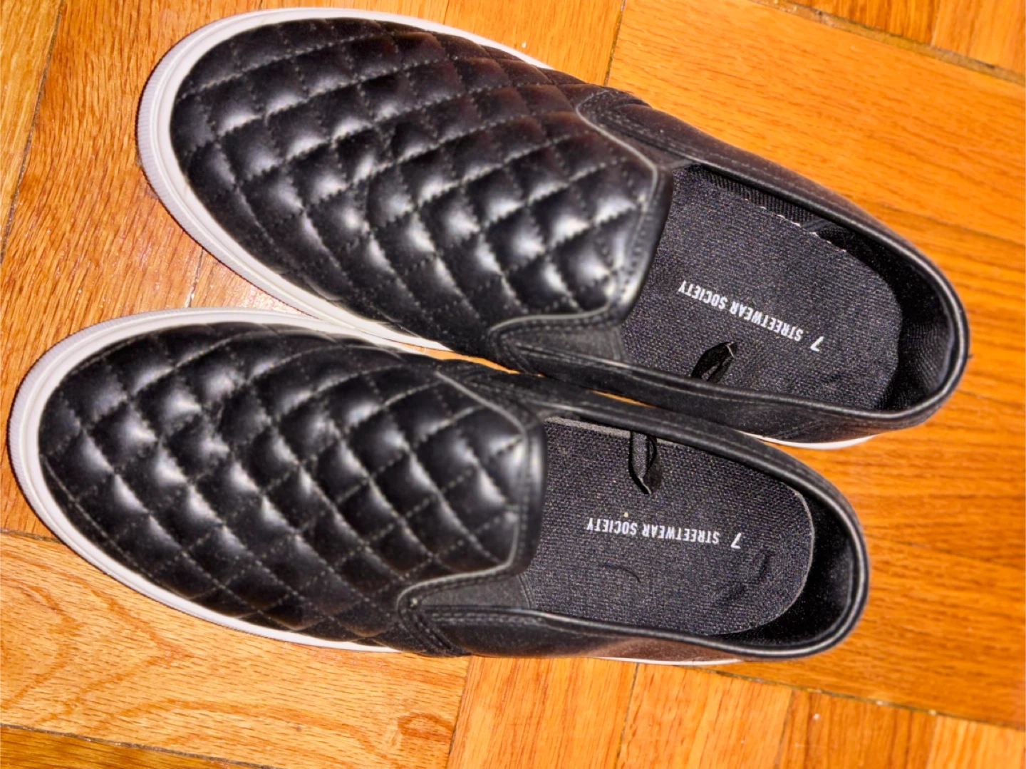 Selling a pair of Streetwear Society slip-on shoes in black. They are a size 7. These shoes have a quilted design on the upper part and a white sole. Perfect for casual wear.