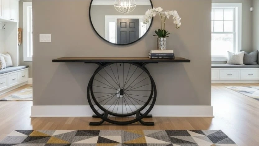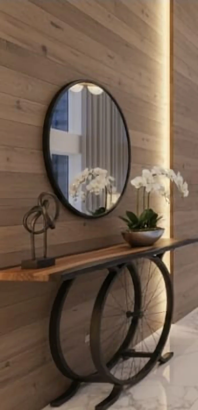 A unique console table featuring a rustic wood and black epoxy top and a striking base made from bicycle wheels. It's a great conversation starter for your entryway or living space. This table is perfect for displaying decor or as a surface for your keys and mail.