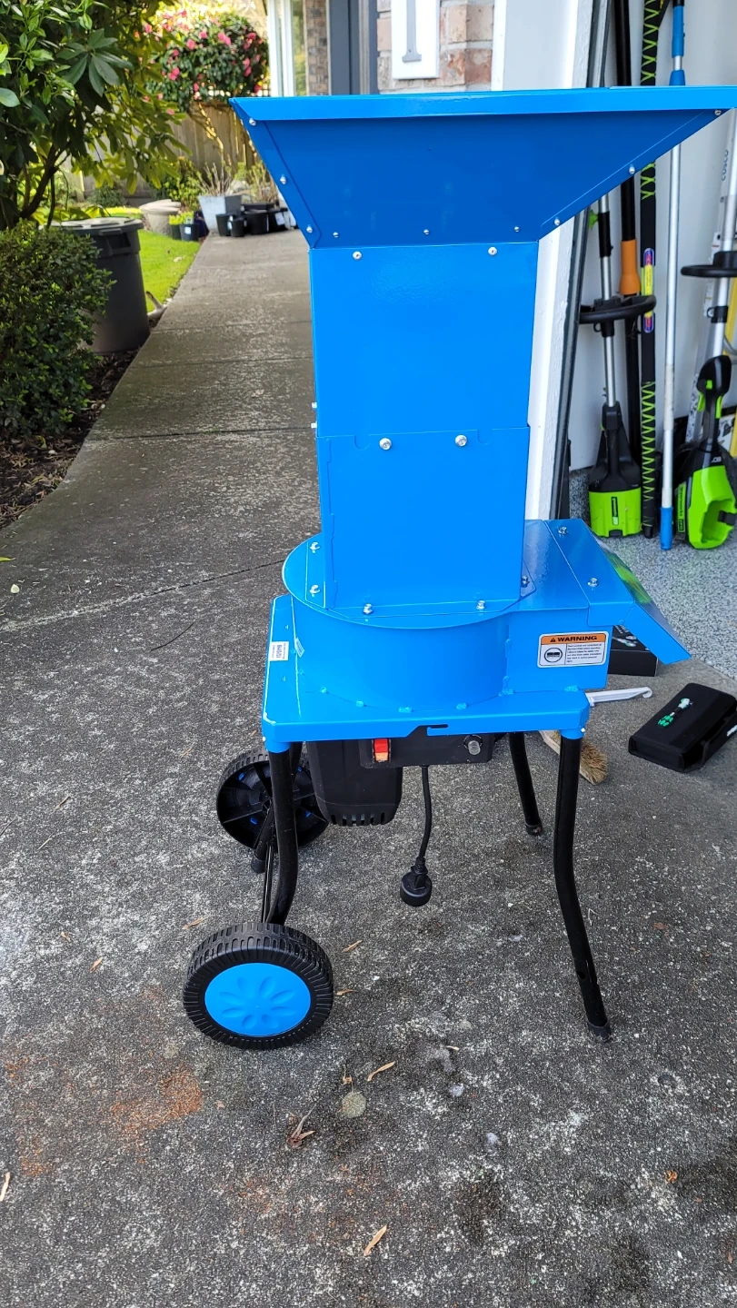This Landworks leaf mulcher shredder is electric and comes in a bright blue colour. It has a 11" cutting blade and a .5" cutting capacity for leaves, grass, and clippings. The shredder is mounted on wheels for easy transport.