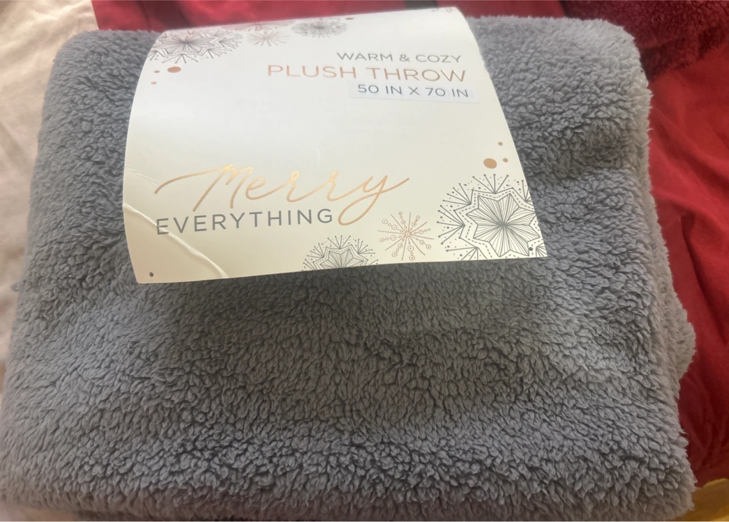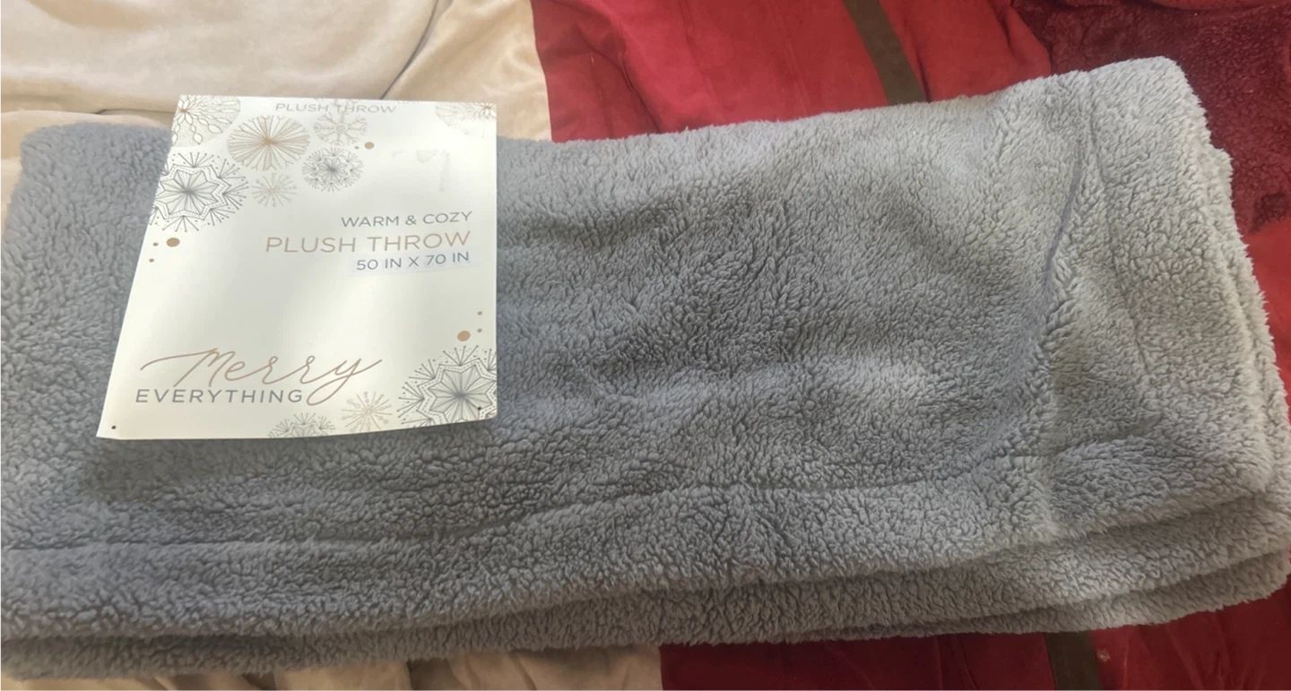 I'm selling a warm and cozy plush throw. It measures 50 inches by 70 inches. Perfect for snuggling up on the couch!
