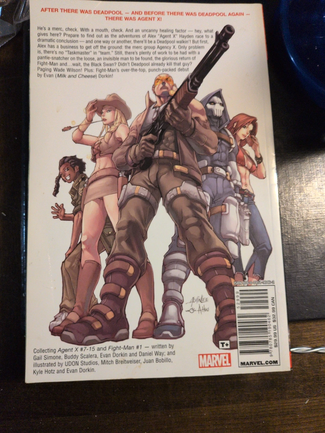 Selling a Deadpool Classic featuring Agent X comic book from Marvel. It's in great shape and ready for a new reader! Collecting Agent X #7-15 and Fight-Man #1, written by Gail Simone, Buddy Scalera, Evan Dorkin and Daniel Way. Originally bought for $29.99 CAD.