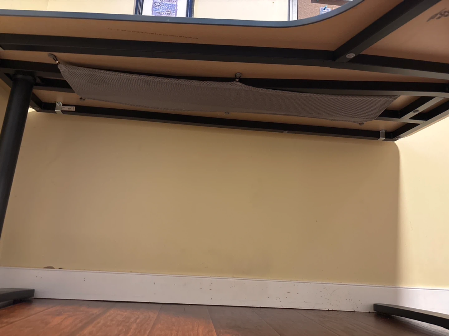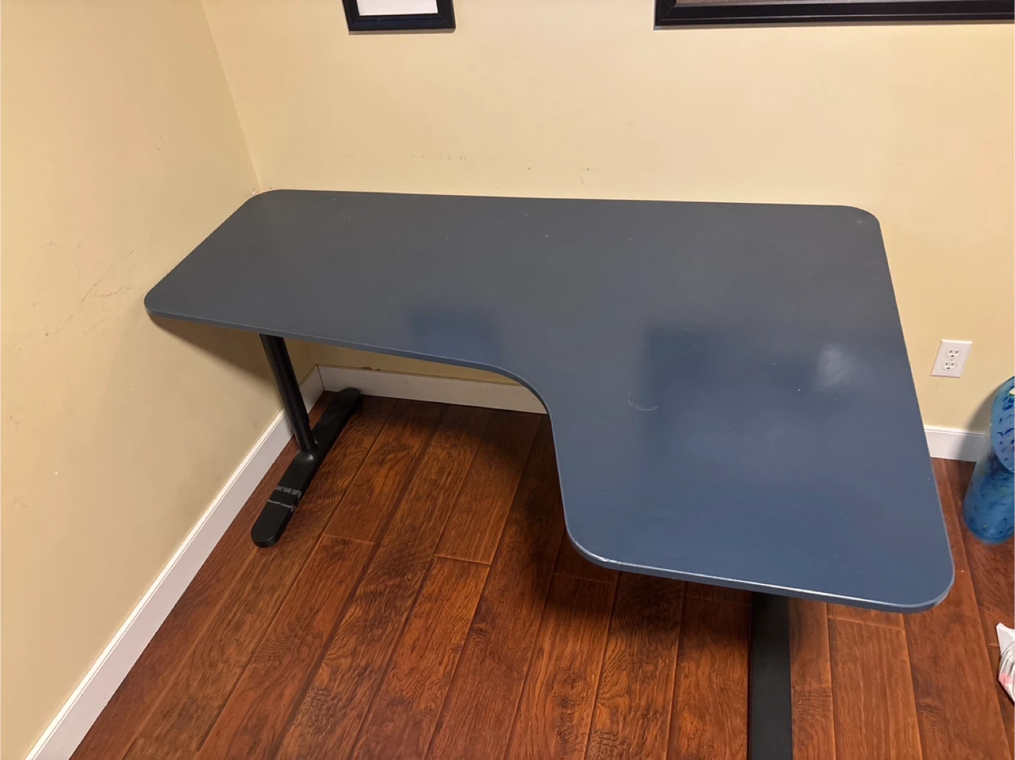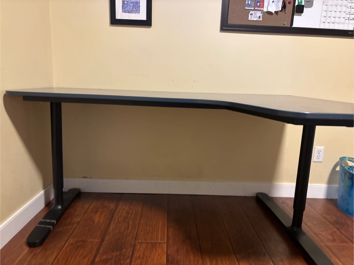 This L-shaped desk is a great addition to any home office or workspace. It features adjustable legs for customized height. Includes a mesh cable management net underneath.