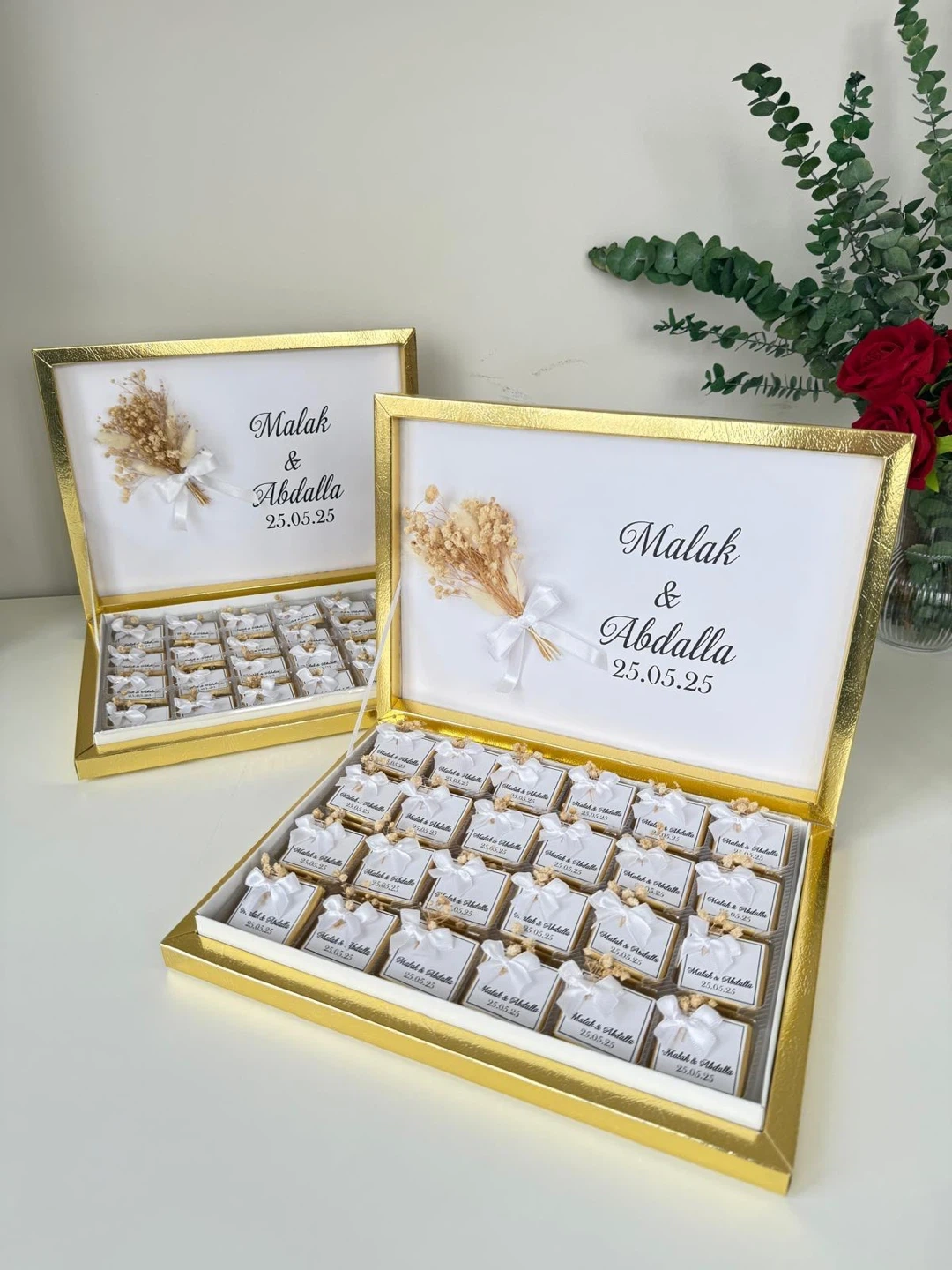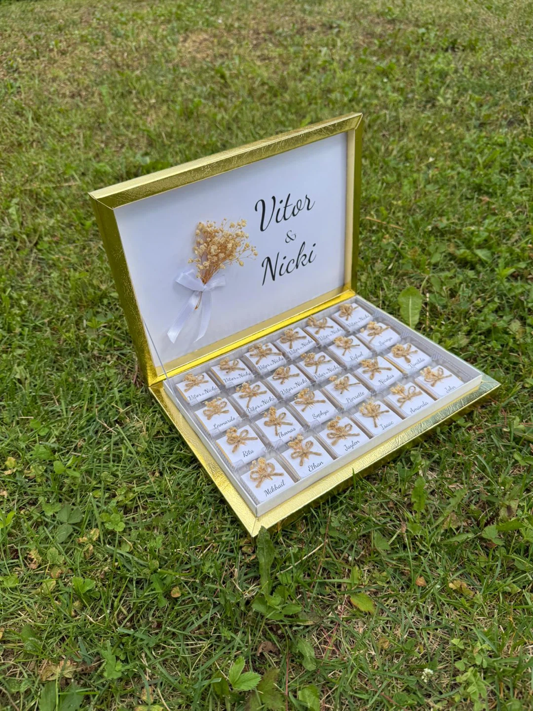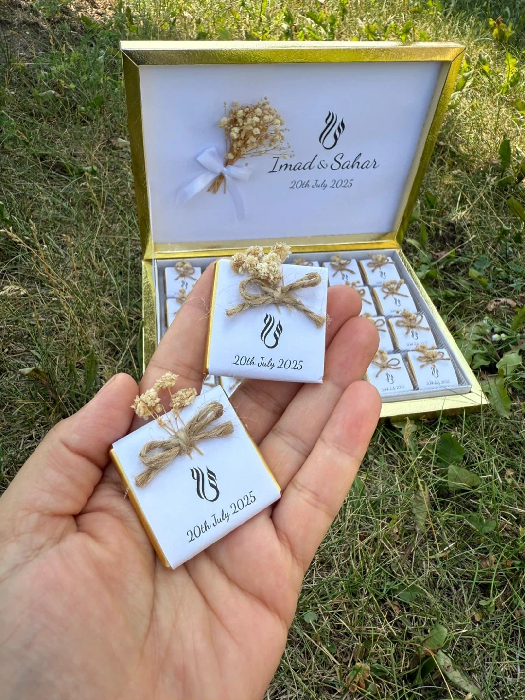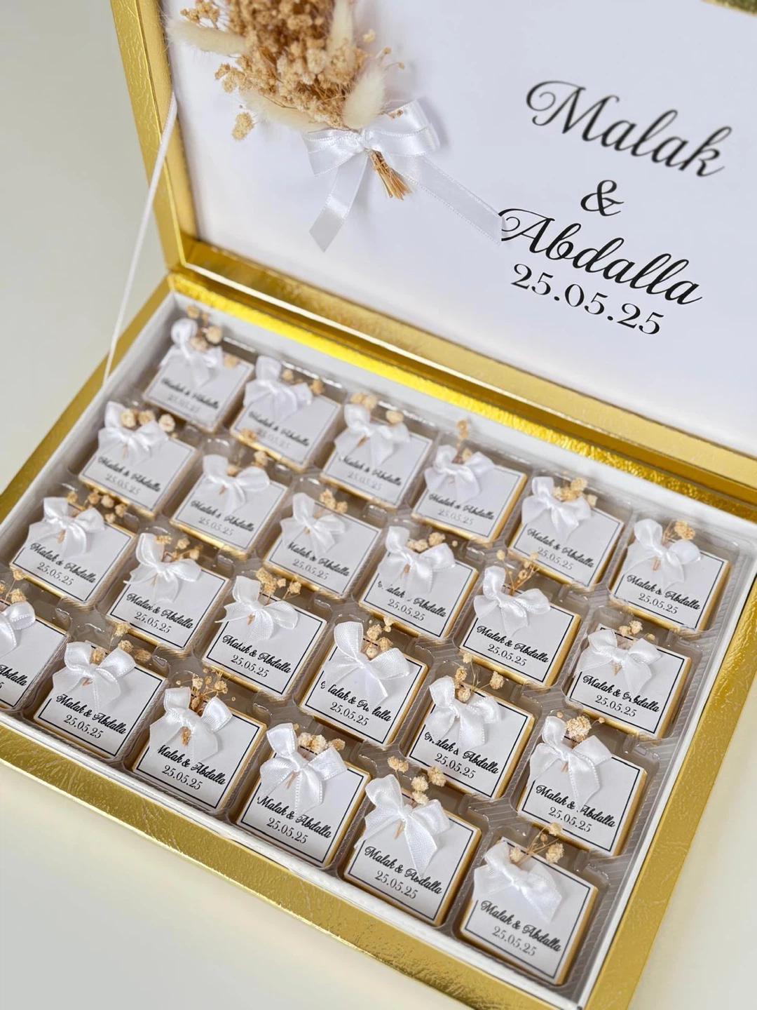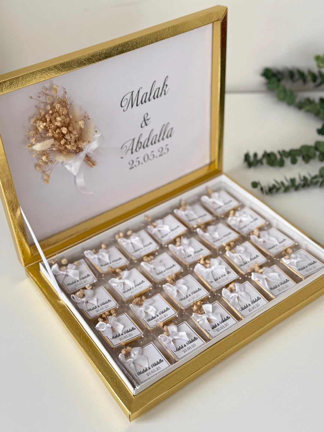 Personalized chocolates for special occasions. Box includes 25 individually wrapped chocolate pieces, each tied with a white ribbon and adorned with dried flowers. The lid is customisable with names and dates. Perfect for wedding favours or as a sweet gift!