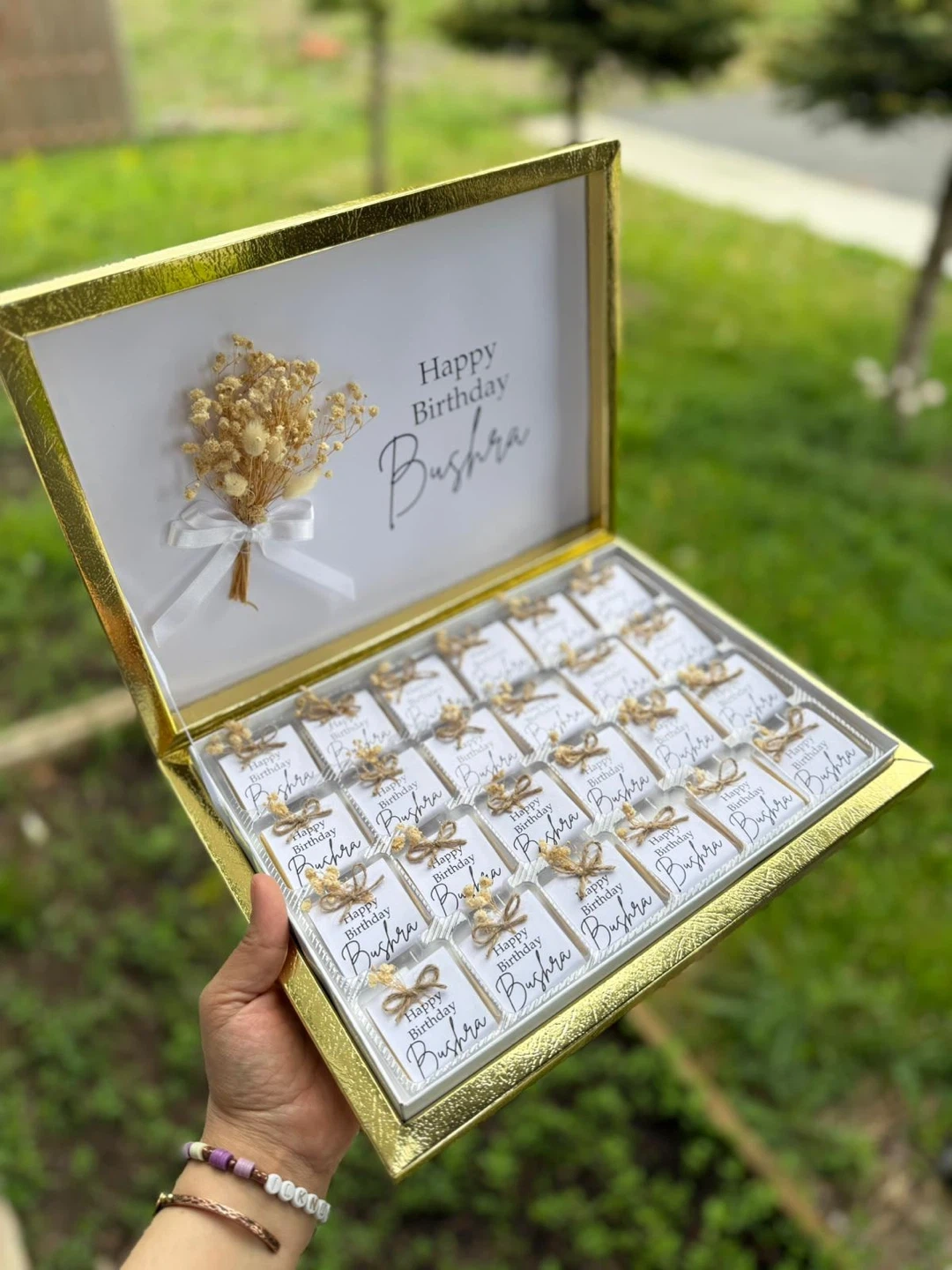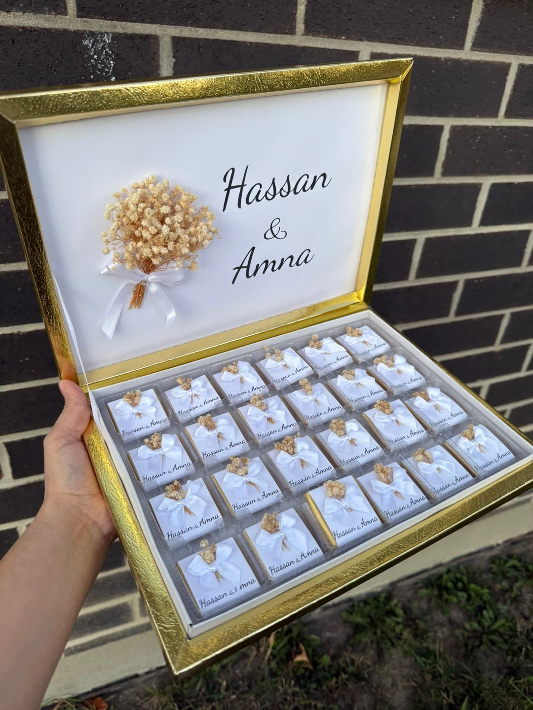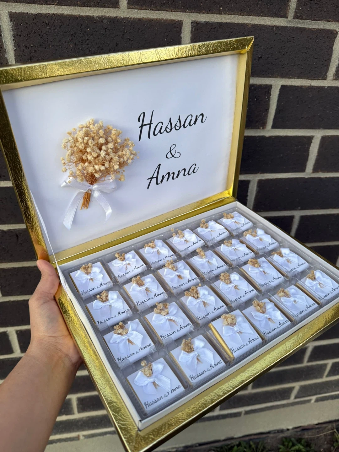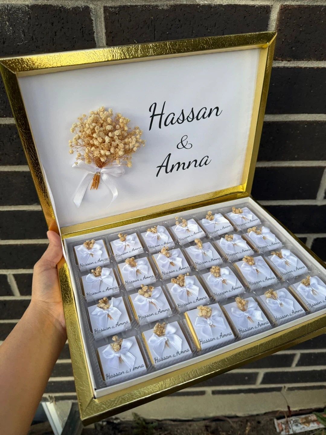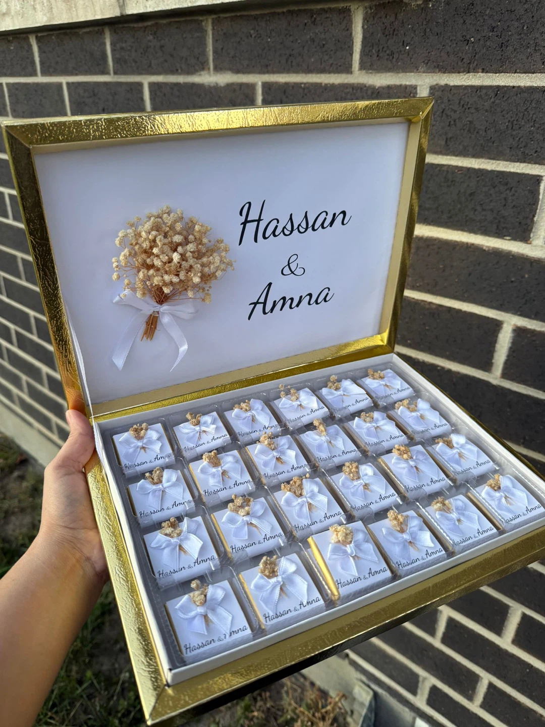 Personalized chocolates for special occasions. Box includes 25 individually wrapped chocolate pieces, each tied with a white ribbon and adorned with dried flowers. The lid is customisable with names and dates. Perfect for wedding favours or as a sweet gift!