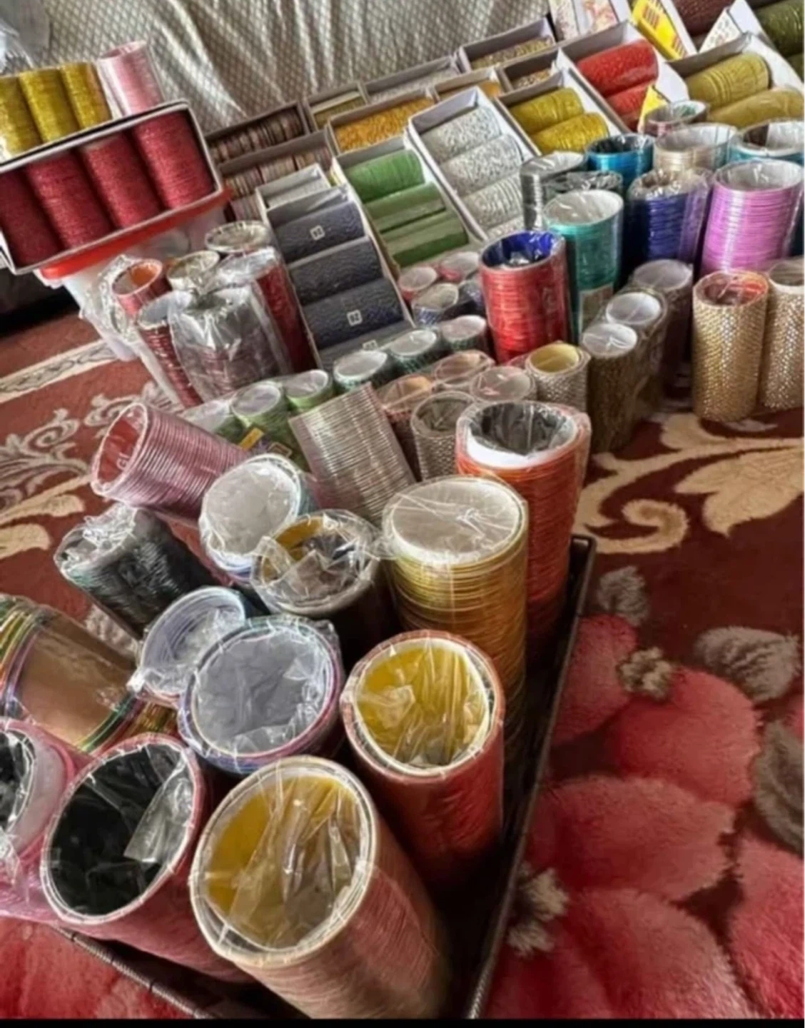 A large collection of colourful bangle bracelets in various shades. These bangles are made from a metal material and come in many sizes, perfect for accessorizing any outfit. They're great for parties and special occasions!