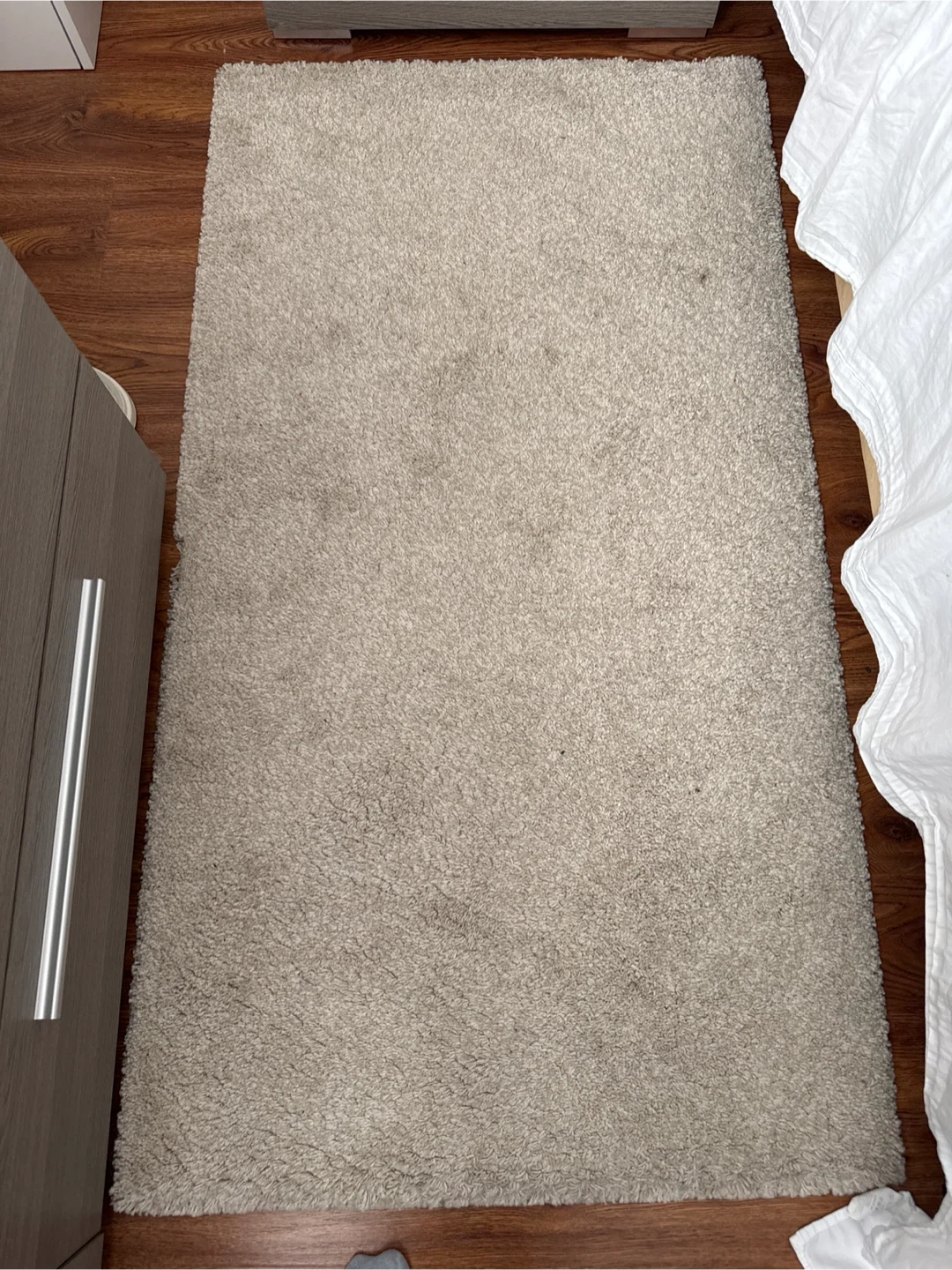 A shaggy area rug in a light beige colour. It's made of synthetic material and feels soft underfoot. This rug would be great for adding warmth to a bedroom or living space. 3 parts.