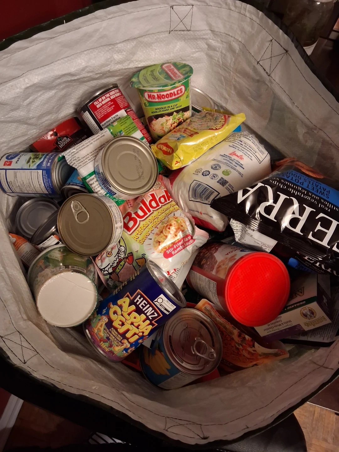 A large reusable bag filled with various canned goods, instant noodles, and snacks. Includes items from brands like Heinz and Mr. Noodles. Perfect for stocking up your pantry! FREE FREE TO ANY INDIVIDUAL OR FAMILY IN NEED!! NOTHING IS EXPIRED. MYSELF AND MY FAMILY JUST DONT EAT THESE ITEMS!!