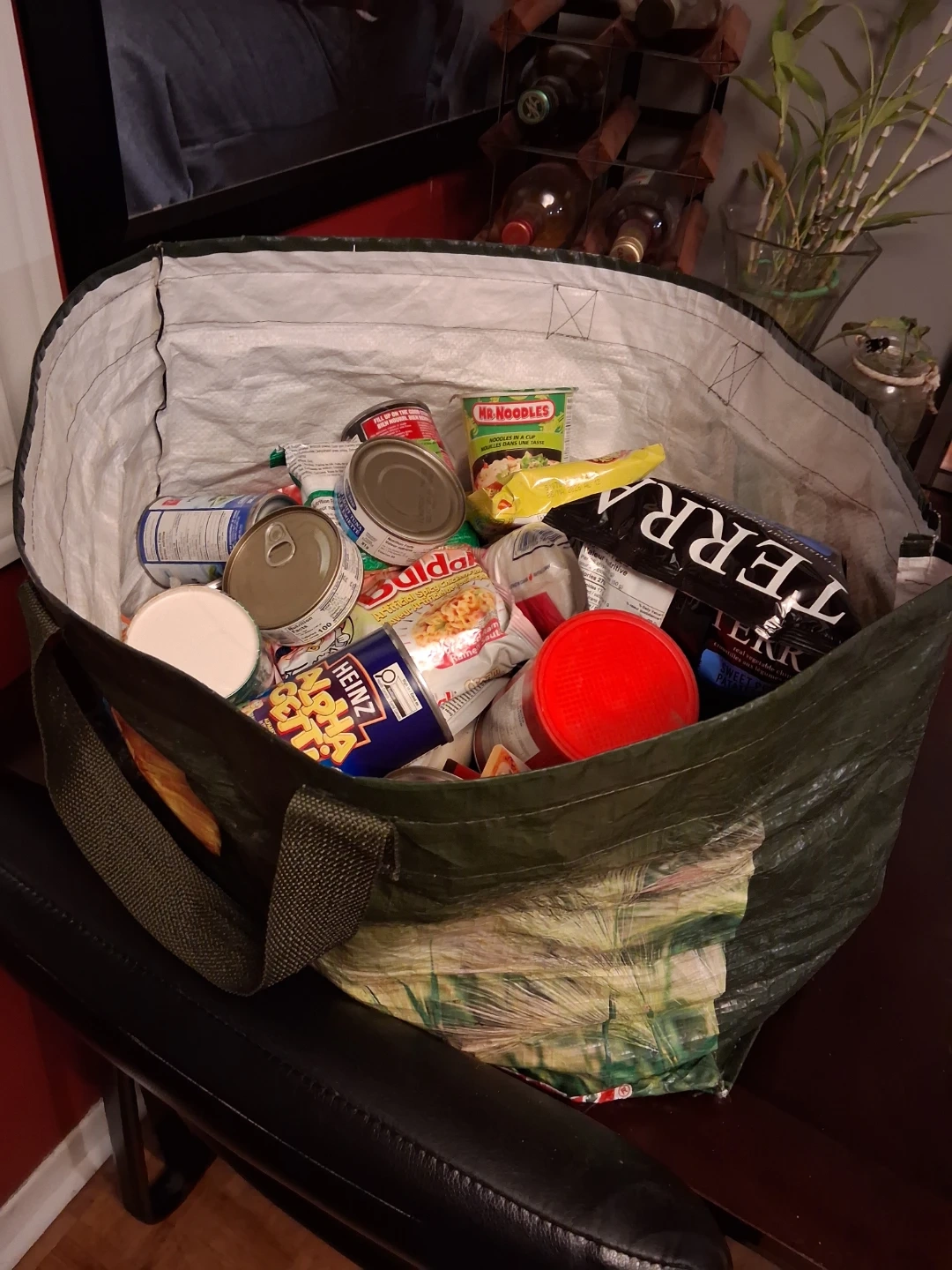 A large reusable bag filled with various canned goods, instant noodles, and snacks. Includes items from brands like Heinz and Mr. Noodles. Perfect for stocking up your pantry! FREE FREE TO ANY INDIVIDUAL OR FAMILY IN NEED!! NOTHING IS EXPIRED. MYSELF AND MY FAMILY JUST DONT EAT THESE ITEMS!!