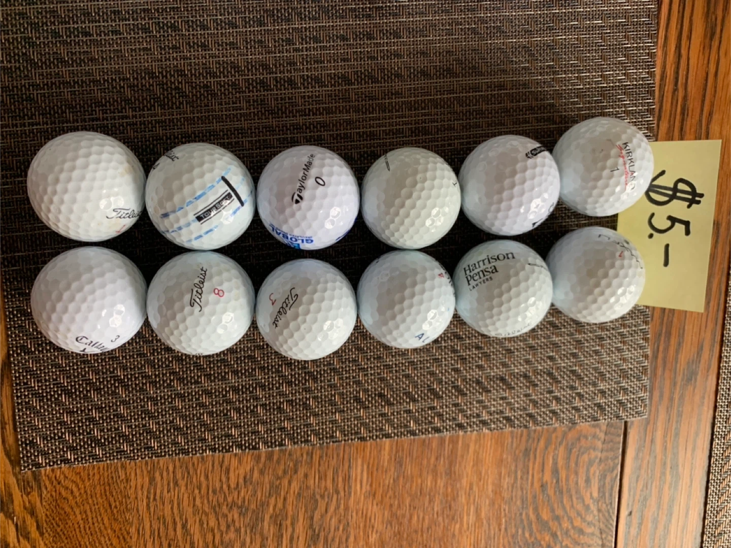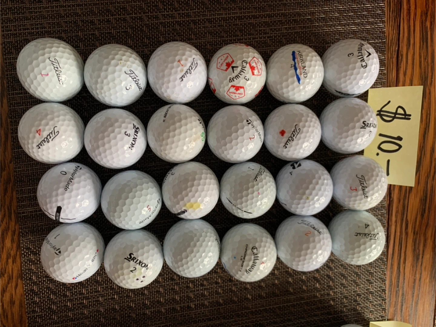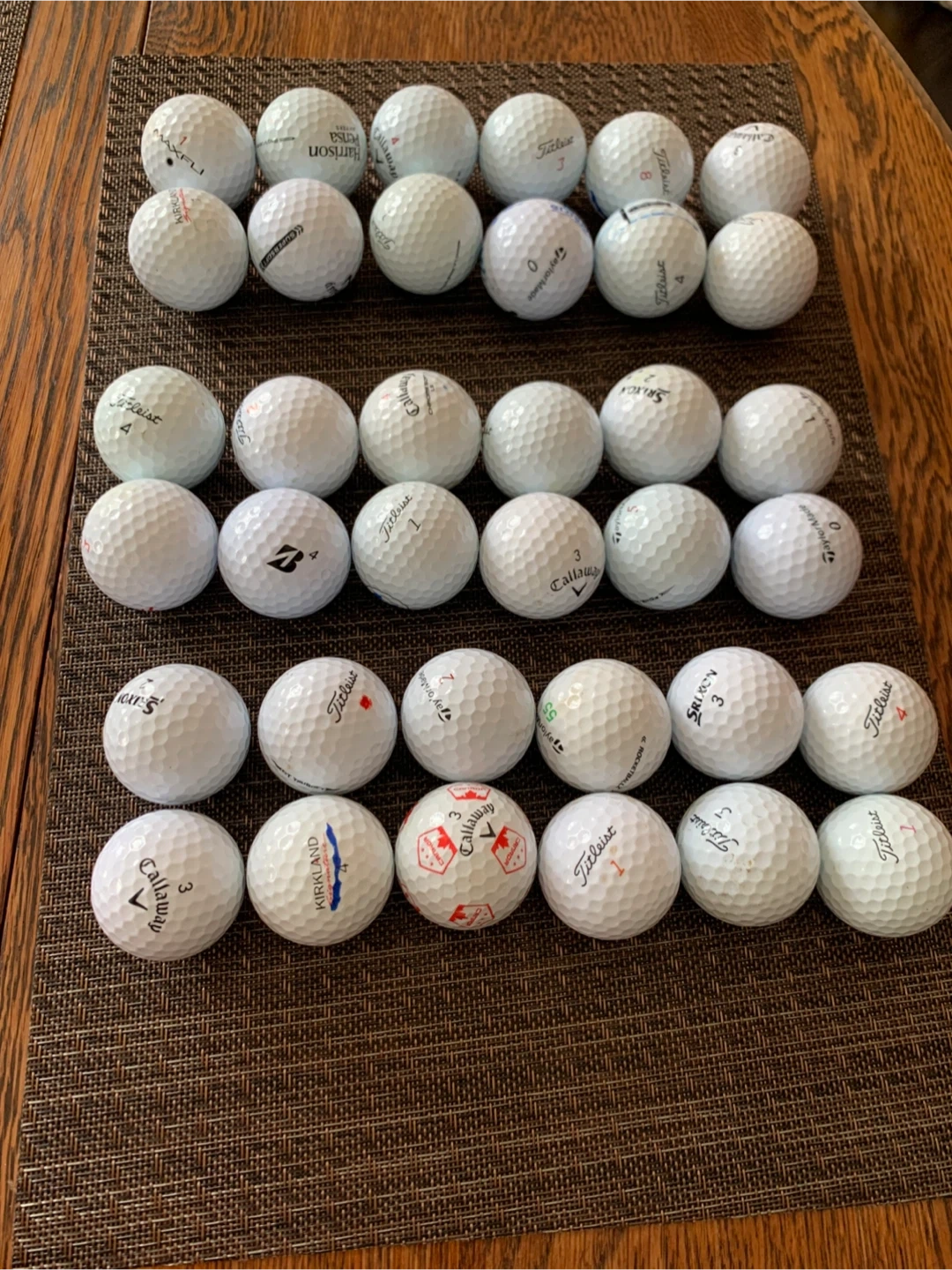 A collection of used golf balls from various brands. Includes Titleist, Callaway, Srixon, and Kirkland. Balls are assorted models and conditions. Selling as is. Great for practice or casual rounds!