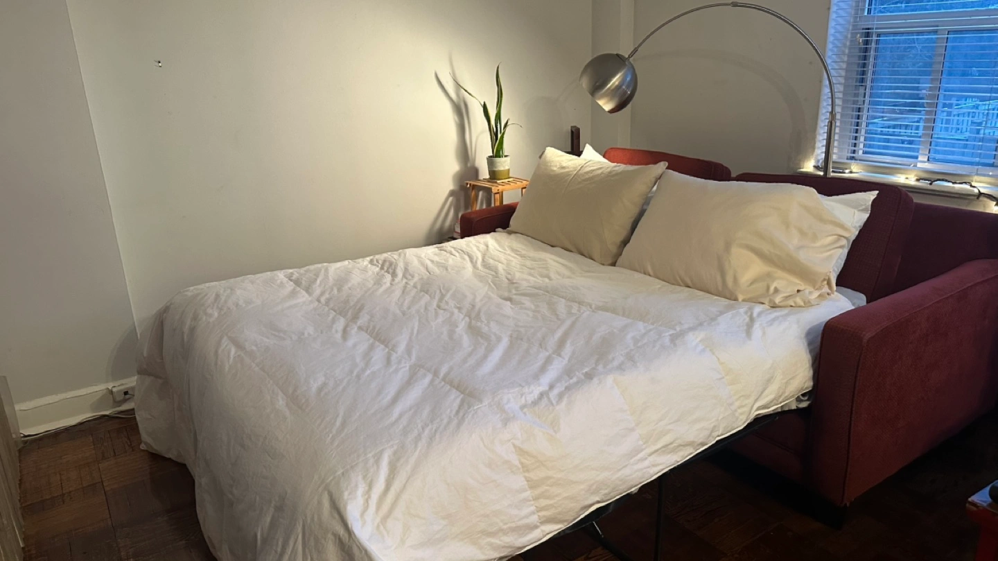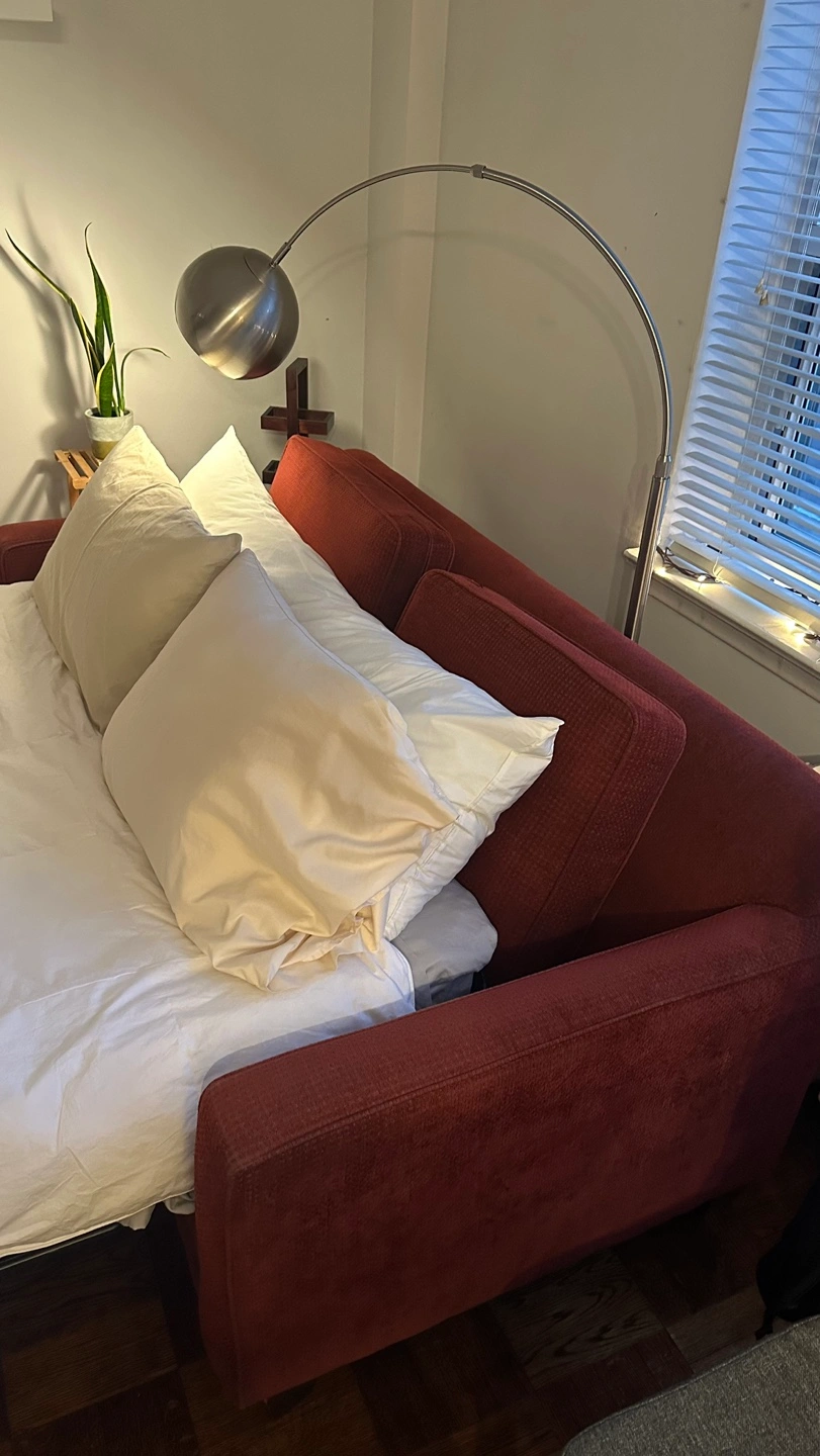 Three-seater sofa and matching ottoman. Burgundy fabric upholstery. Ottoman has storage. Modern style. Custom made by Wilson Furniture, wood frame. Pull out bed. No stains. Mattress is in good condition and has always has a protector on it. Video available if seriously interested. Available for