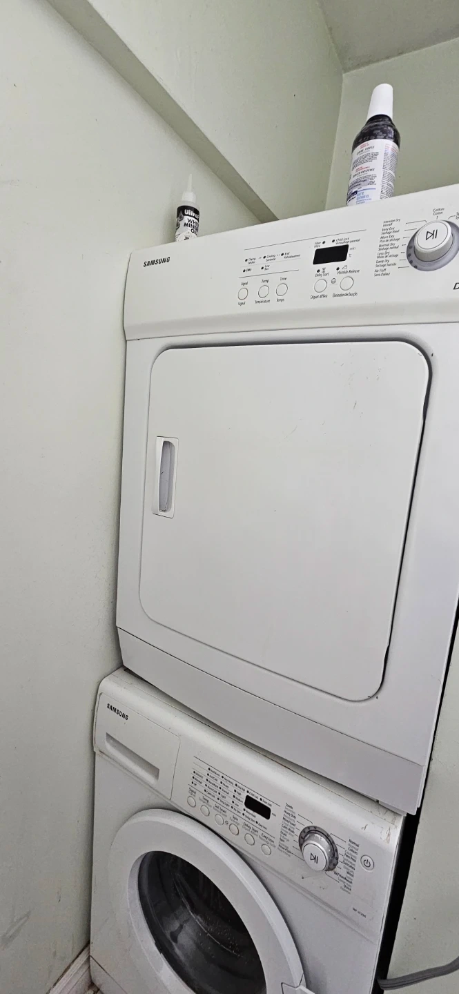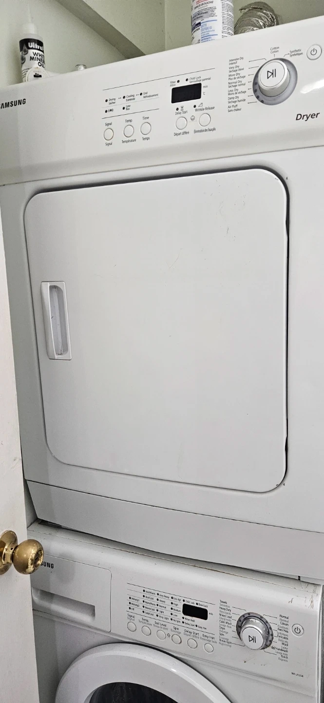 Selling a Samsung dryer. Dryer in good working condition and ready for a new home. Great for small spaces 24" condo size. Washing machine ( don't have to buy) it is for free if you wish. Washer need to be repaired. All for $160 of just dryer.