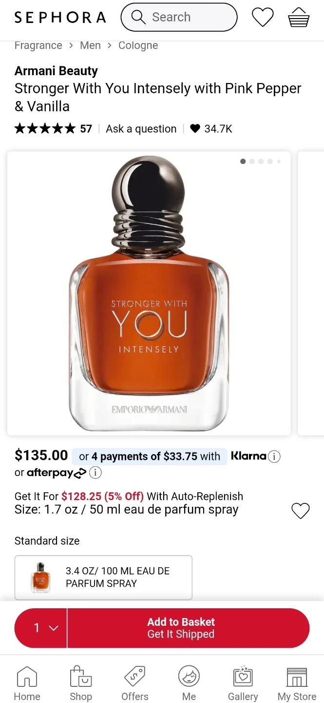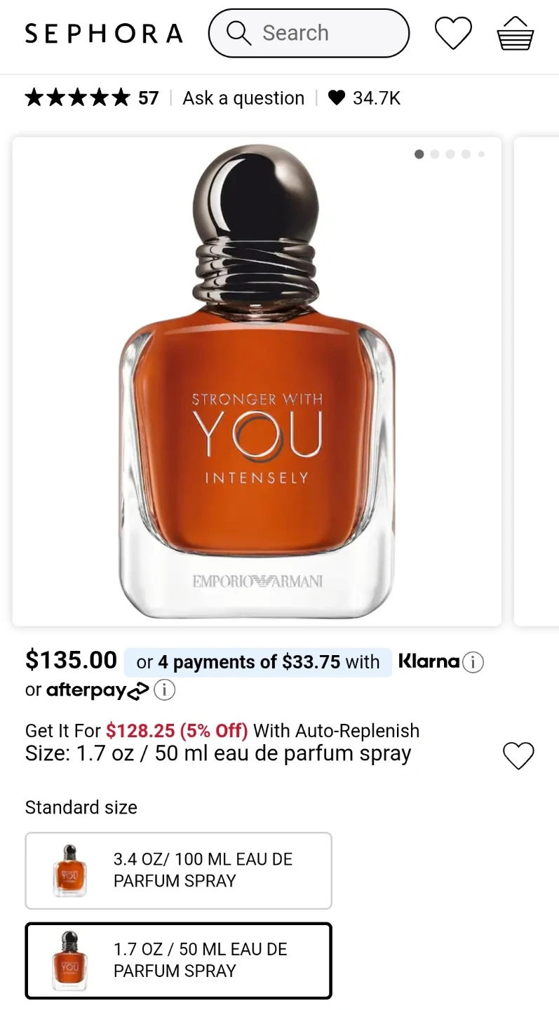 Emporio Armani Stronger With You Intensely Eau de Parfum spray. This fragrance is 50 ml. It's a scent with notes of pink pepper and vanilla.