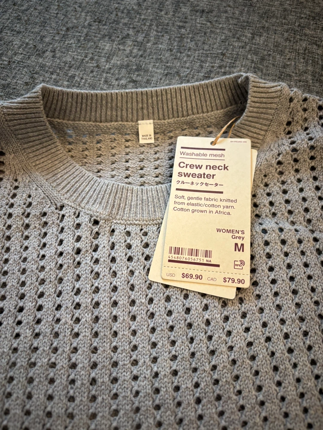 This is a MUJI washable mesh crew neck sweater. It's made from elastic/cotton yarn knitted with a soft, gentle fabric. The cotton is grown in Africa. It's a great option for warmer weather or layering!