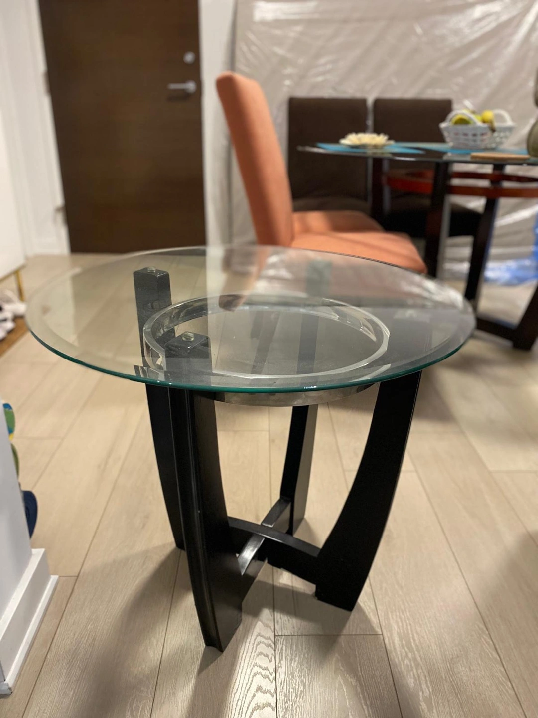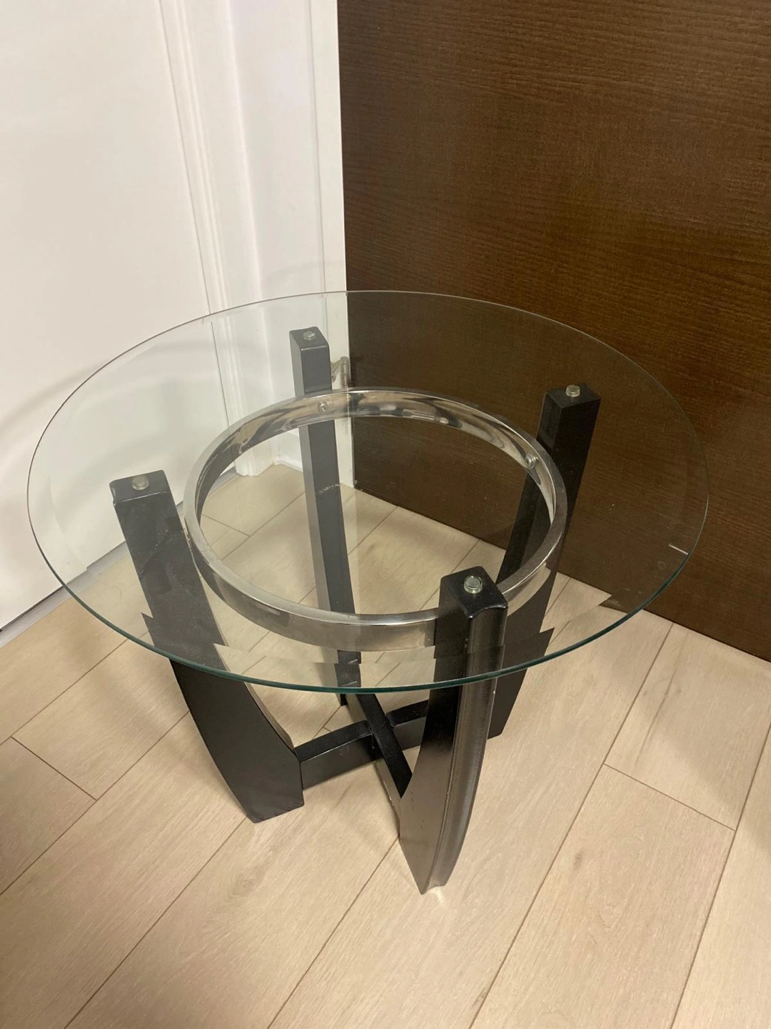 Round glass top tables with chrome ring and brown wooden base. Great looking for living room. $50 total for both tables.