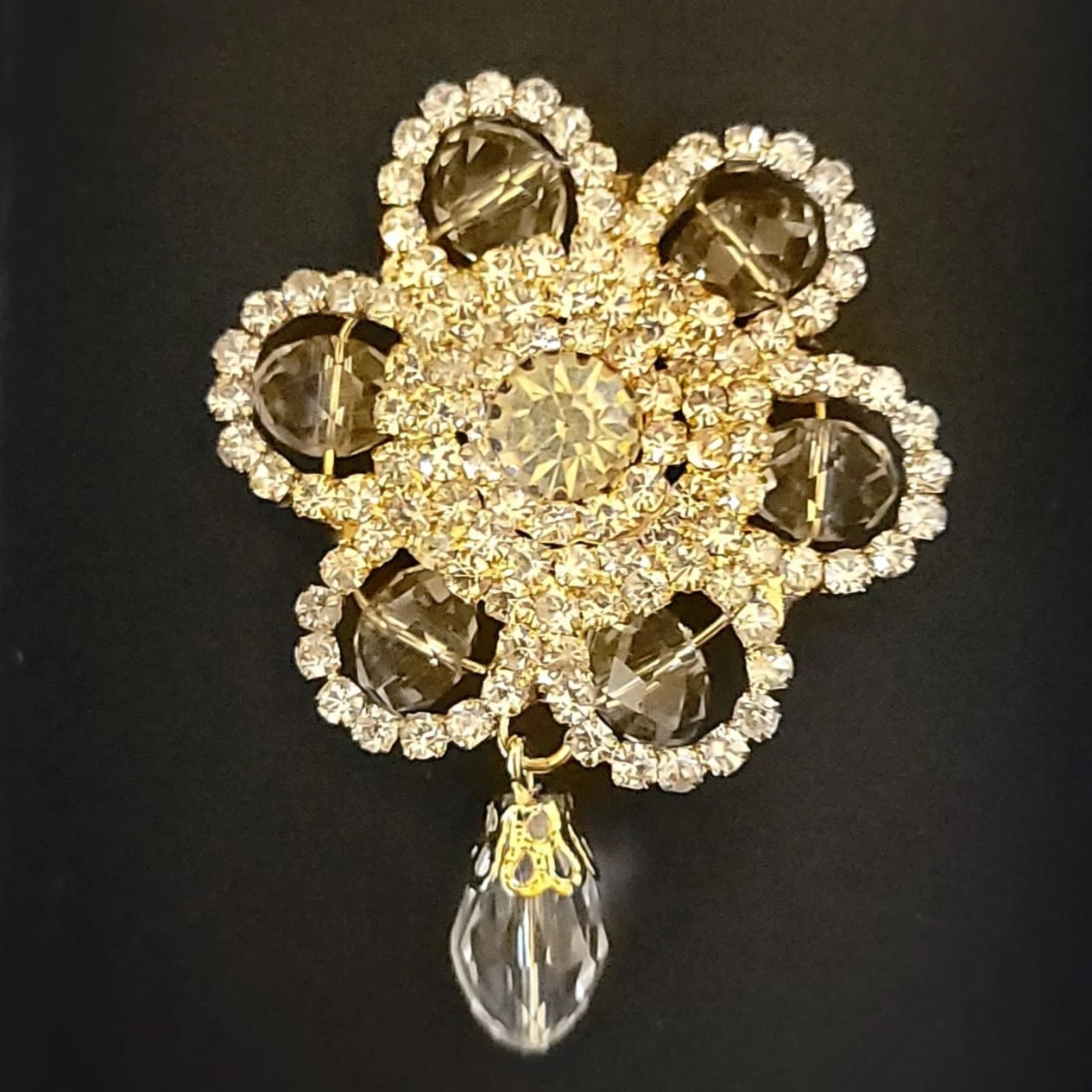 Sparkly flower-shaped brooch. It's adorned with clear and smoky crystals. A delicate crystal teardrop hangs from the bottom.