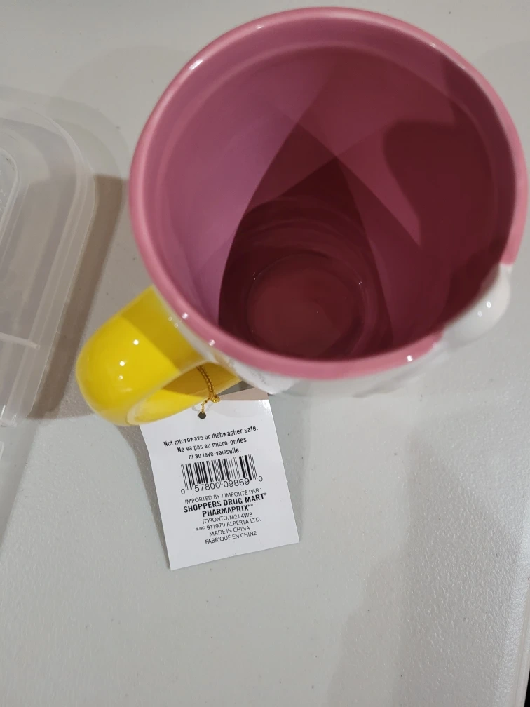 Brand new Shoppers Drug Mart Easter bunny mug! It has a cute design with an Easter bunny and polka dots. The handle is yellow and the inside is pink. Perfect for Easter or any time you want a cheerful mug for your coffee or tea