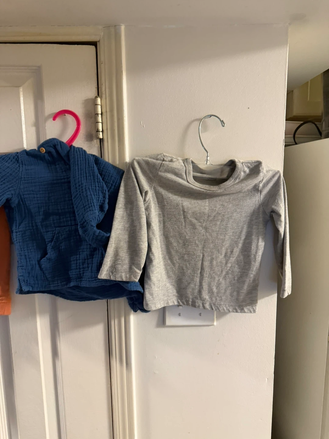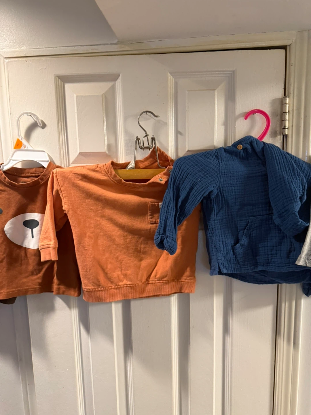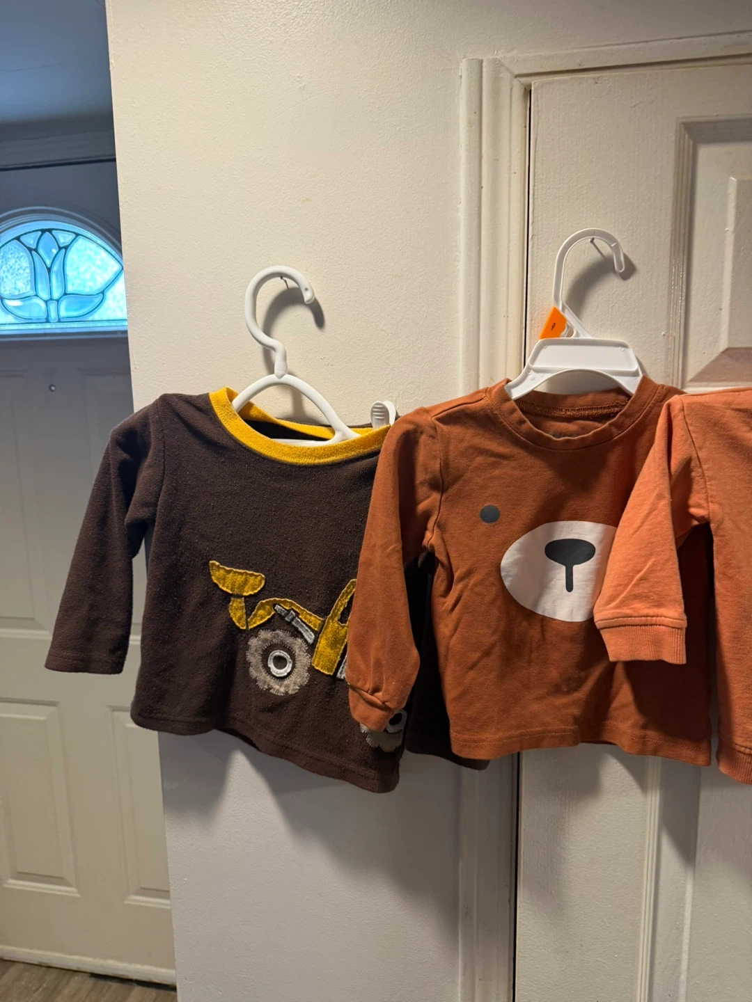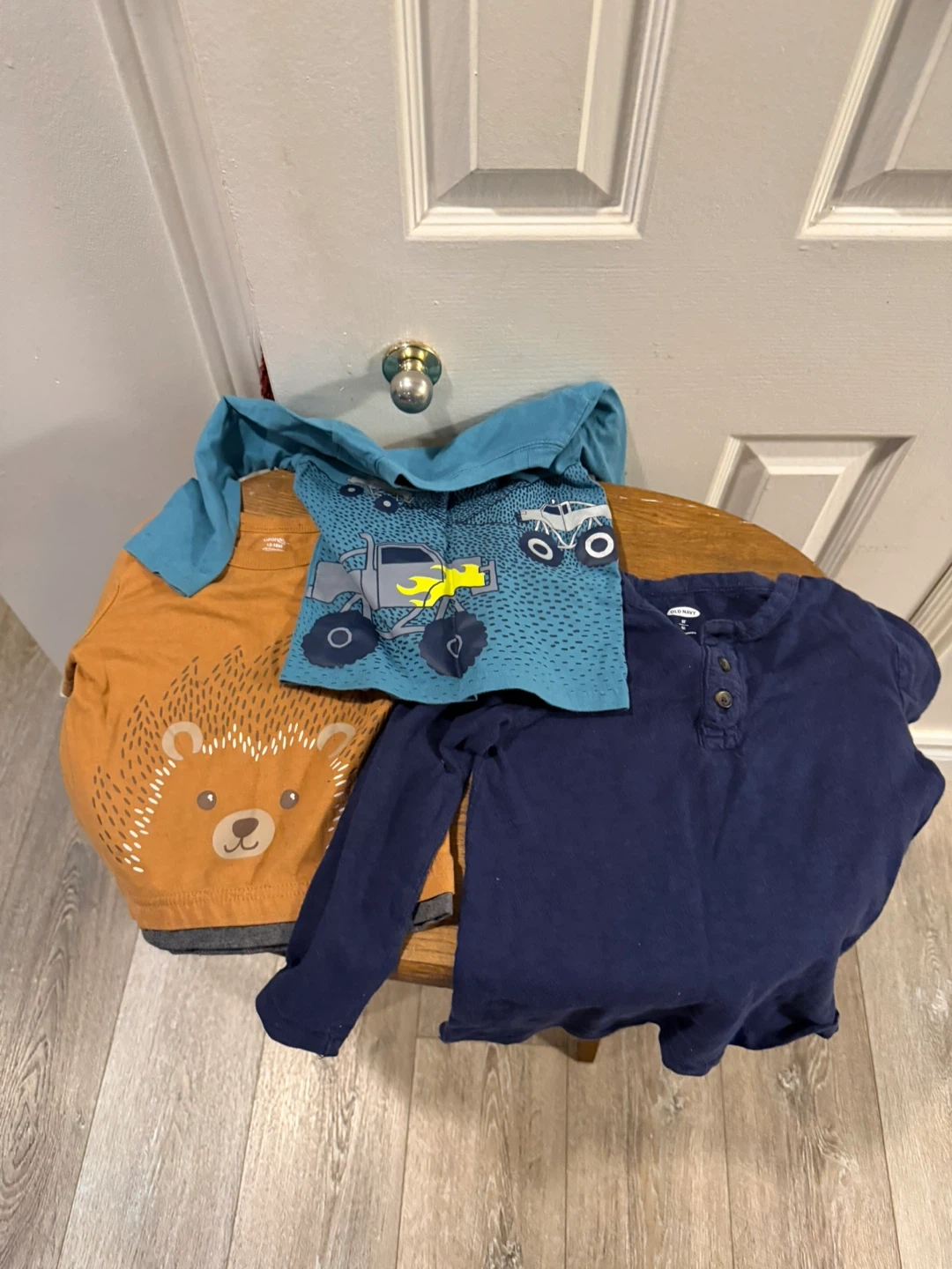 This bundle includes five long-sleeve shirts for kids. Featuring a variety of designs including a bear, a tractor, and a blue textured hoodie. Perfect for everyday wear! 12 to months