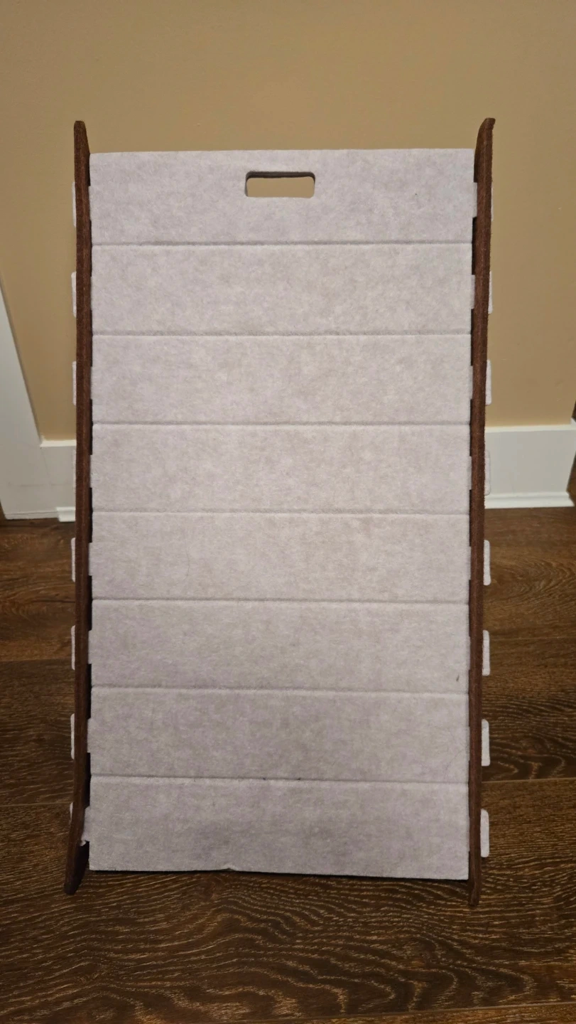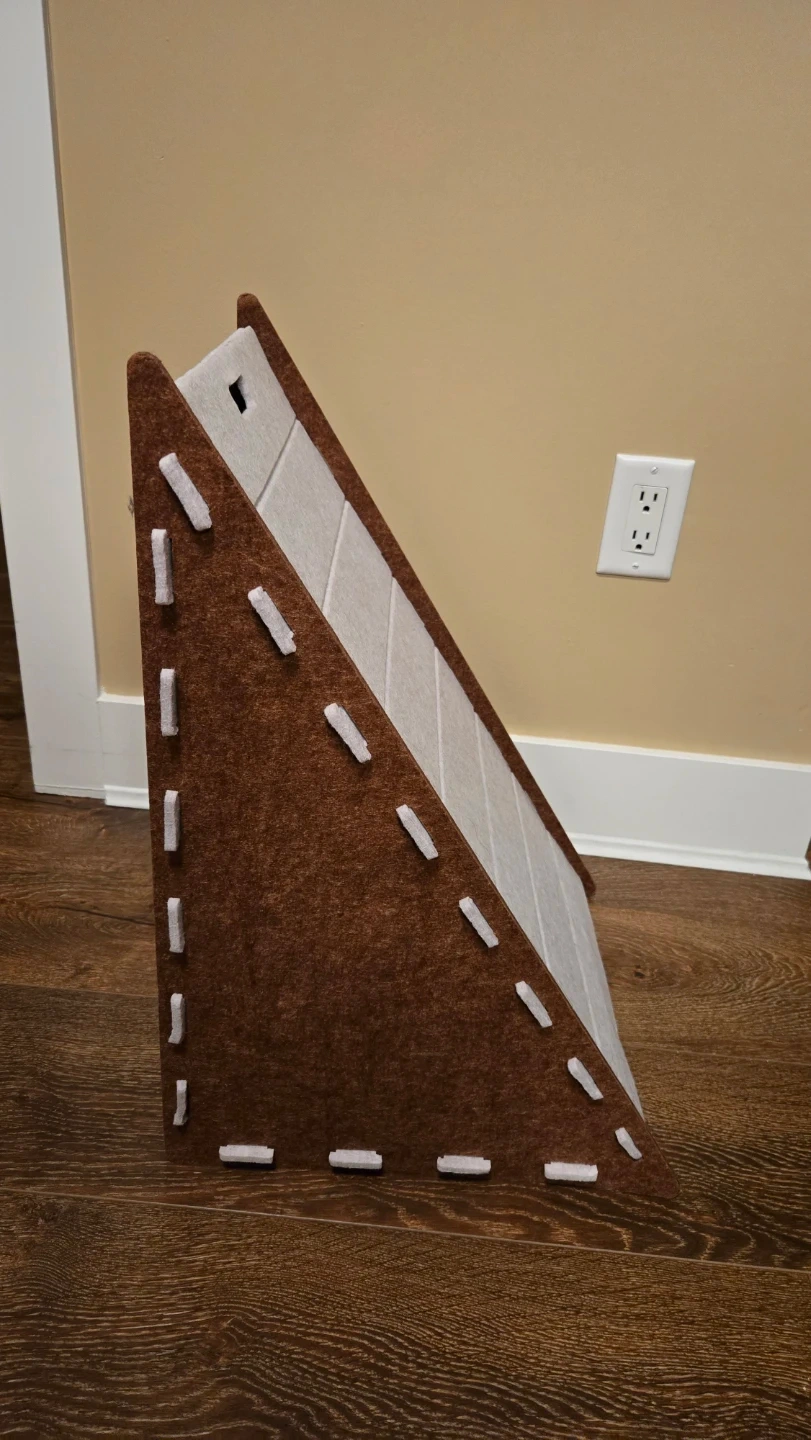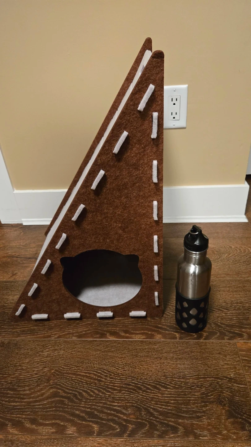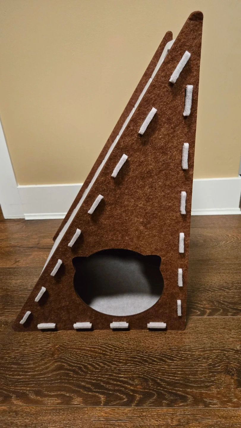 A cozy felt cat condo with a fun cut-out entrance, perfect for your feline friend to lounge or play in. It's made of durable felt material and designed in a unique triangular shape. This condo provides a private space for cats. It's easy to assemble and move around your home.
