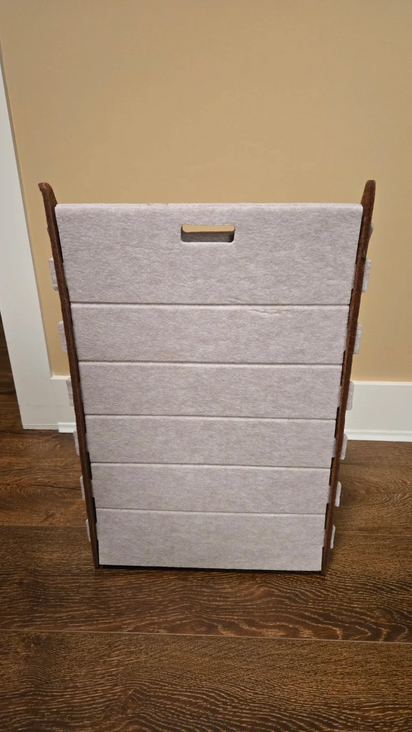 A cozy felt cat condo with a fun cut-out entrance, perfect for your feline friend to lounge or play in. It's made of durable felt material and designed in a unique triangular shape. This condo provides a private space for cats. It's easy to assemble and move around your home.