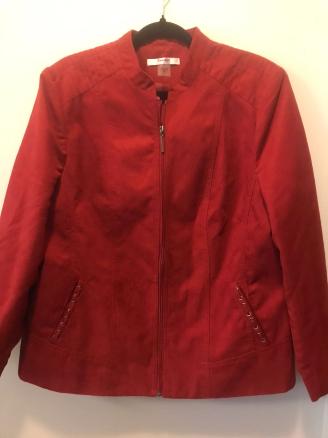 TanJay women's red zip-up jacket. 18p Features a stand-up collar , shade type material