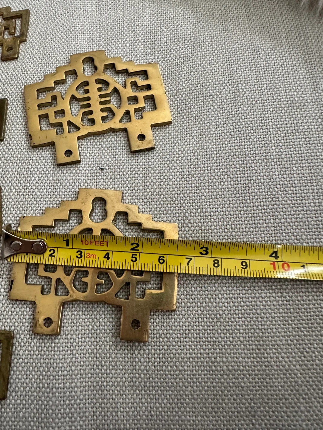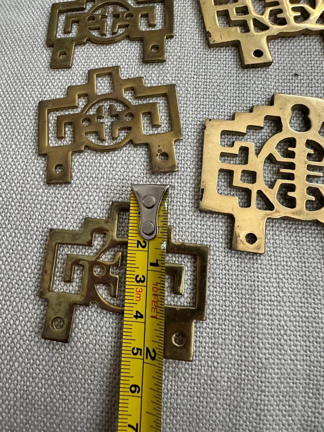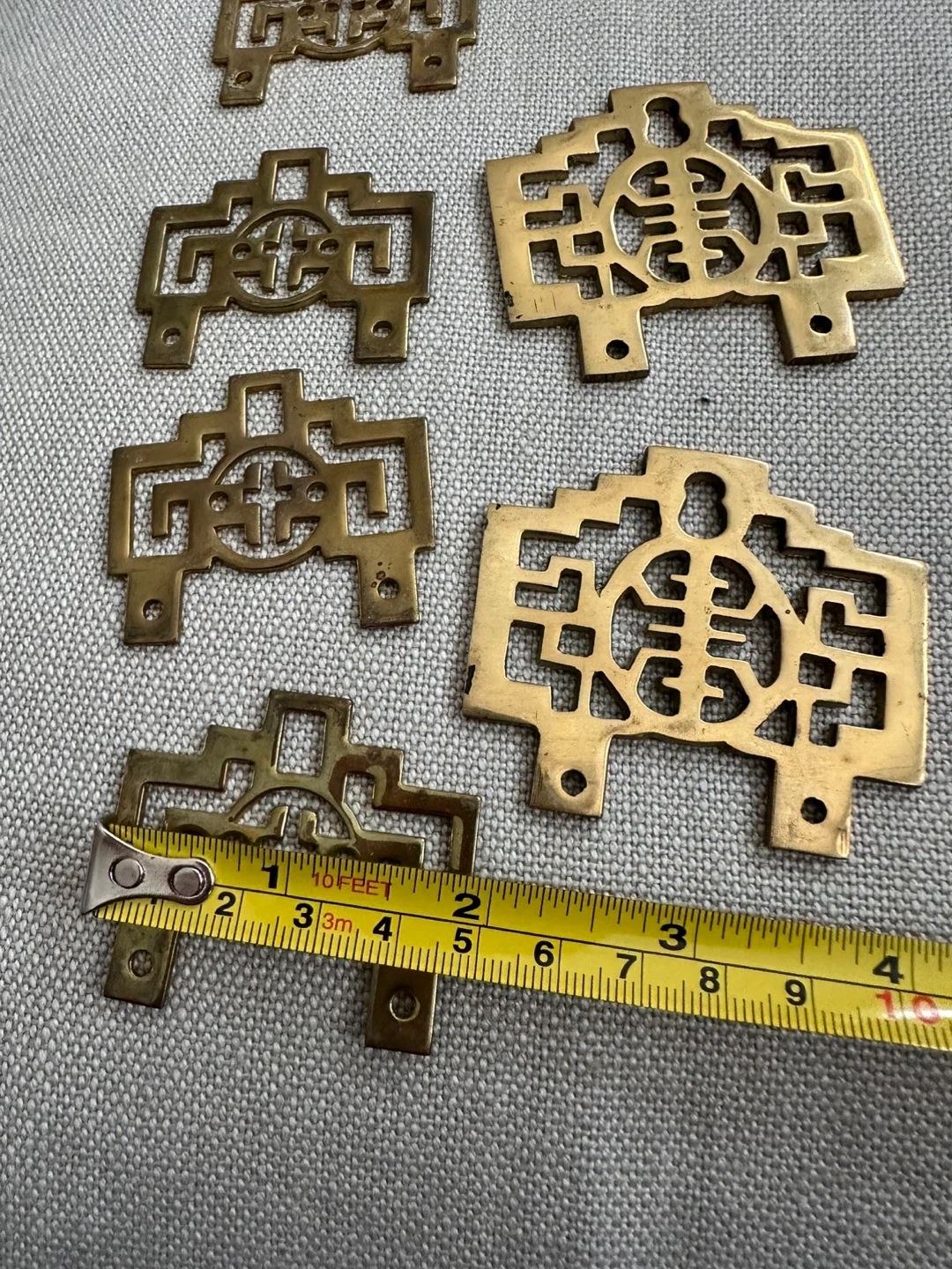 Set of 6 brass decorative accents with intricate cutout designs. Measure approximately 3.5 inches wide by 2.5 inches tall. Ideal for furniture embellishment or craft projects.
